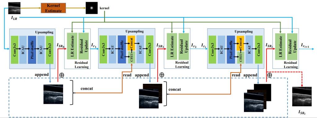 对于超声临床诊断而言,超声影像超分辨(ultrasound image super-resolution)可以提高超声成像质量,从而提高疾病诊断的准确性。但由于传感设备和传输介质的差异,实际场景中超声成像其退化模糊过程是未知且不可控的。为了解决未知退化场景超声医学影像准确超分辨的难题,团队提出了一种有效的基于退化模糊自估计且结合渐进残差学习和记忆提升机制的超声影像盲超分方法,初步实现了真实场景超声影像准确超分辨。相关研究成果发表在人工智能、计算机医学信息交叉领域一区TOP期刊《IEEE Journal of Biomedical and Health Informatics》(IF: 7.7)。beat365官网为论文第一完成单位,计算机学院刘恒教授、硕士生刘建勇分别为论文第一、第二作者。