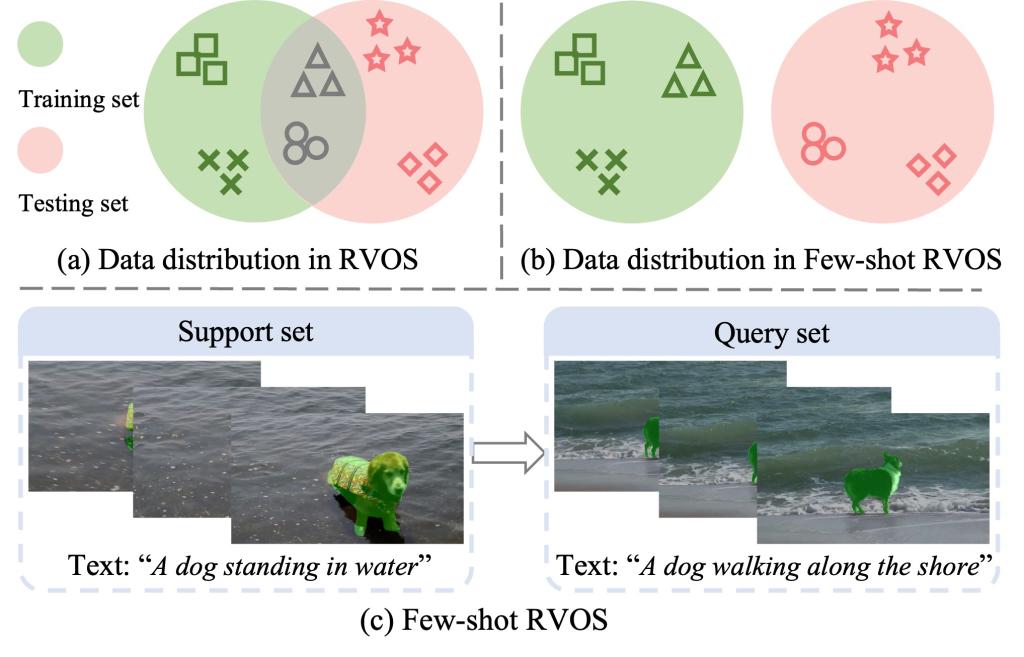 当前深度学习参考视频目标分割(RVOS,Referring Video Object Segmentation)已有工作都要求特定场景具有足够丰富的文本及视频多模态联合标注数据。但在缺乏标注数据的新应用场景,以较低成本实现多样化视频有效目标分割是一个迫切需要解决的问题。团队基于Transformer架构,提出了一种跨模态少样本亲和力学习的新方法,根据少量样本建立多模态亲和关系,为多样化的数据学习新的语义信息;首次构建了的FS-RVOS(Few-shot RVOS)基准,在只有少量标注样本的情况下,采用交叉注意力方式分层融合视觉和文本特征以获得特定类别的鲁棒特征表示,为最终实现真实陌生场景参考视频目标分割指明了方向。