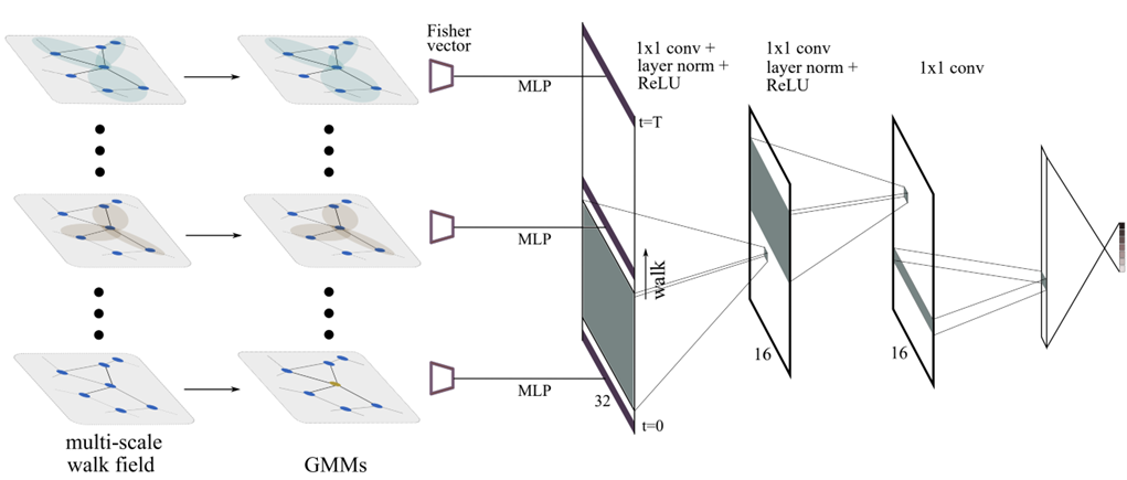 为了解决上述问题,团队首先提出了一种可用于3D点云表示学习的高斯混合模型图卷积神经网络。该网络可利用多尺度二阶随机游走同时捕获点云的远程语义依存关系和局部拓扑子结构。为了表征不同的路径,在特征编码阶段每个顶点的局部感受野由多条多尺度随机游动路径组成,并采用高斯混合模型隐式地表征游走路径的方向。团队首次使用二阶随机游走提取曲线特征,采用Fisher向量编码高斯混合模型参数,在基准数据集上进行了大量的定性及定量比较,并通过消融实验探讨了超参数的敏感性,为基于曲线特征的几何深度学习及3D视觉分析任务提供了新的见解和分析工具。
