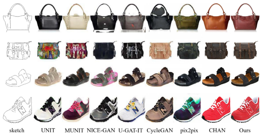 草图的真实感图像生成一直是多媒体智能的一个挑战性的问题。目前已有草图到图像的合成方法,主要通过构建并训练一个生成性对抗网络(GAN)来实现。但由于GAN结构里的生成器通常是由卷积层构成,卷积的局域性会导致生成器的底层模块缺乏全局特征感知能力,在输入的草图具有不完整或线条轮廓缺失的情况下,容易忽略掉草图的全局上下文线索,并使得最终生成的图像缺乏照片级真实感,甚至出现伪影或畸变。已有一些方法考虑引入了自注意力机制来处理,但由于自注意力是关于特征图尺寸二次复杂的,对于大尺寸草图转换其计算成本非常高。