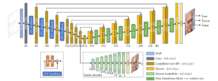 为了解决这些问题,团队提出了一种新颖高效的草图图像合成模型-Sketch2Photo。Sketch2Photo能同时挖掘全局上下文信息和局部领域特征,根据非局部长程依赖和局部关系重建出高质量图像,即使从线条微弱或者线条缺失的草图中也能生成照片般逼真的图像。采用快速傅立叶卷积(FFC)残差块在Encoder网络的底层就构建全局和各种尺度局部感受野,快速获得全局和多尺度局部上下文信息,再在Decoder模块通过连续多个反卷积和Swin Transformer block (STB)单元进行多层次多尺度注意力以及全局依赖关系的特征高效重建,从而获得高质量具有真实感的图像合成结果。为了克服以往方法中要求草图和合成结果图像需要严格对齐的问题,提出了一种新的空间注意力映射(ISAP)模块,可以大大降低草图完整性及匹配对齐的要求。基于提出的生成模型,我们在各种草图包括人脸正侧面以及各种服饰草图数据集进行了各种定量和定性的图像合成实验,相应的图像合成效果图以及与其它最新方法的生成效果对比如图所示。图中(h)列子图和ours列子图是我们提出方法的生成结果。