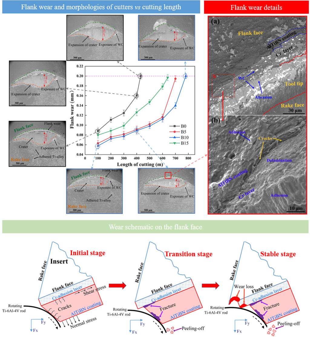 (不同B含量AlTiBN涂层高速干式切削加工钛合金寿命曲线和磨损形貌,以及典型的涂层失效模型)