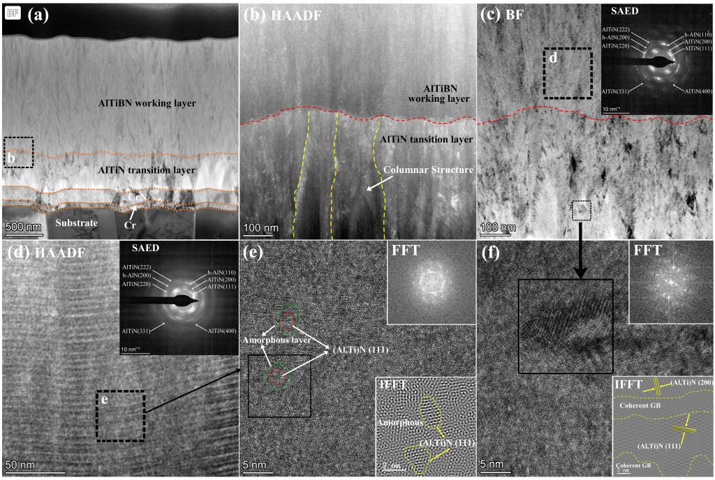 团队提出了基于硼元素原位形成自润滑氧化膜的硼掺杂铝基AlTiBN硬质涂层的设计方法,通过构筑非晶BN包裹(Al, Ti)N纳米晶的复合结构,增强了AlTiBN复合涂层的高温硬度和高温韧性,进而提升了其高速干式切削加工钛合金性能,并提出了该切削条件下的硬质涂层失效模型。