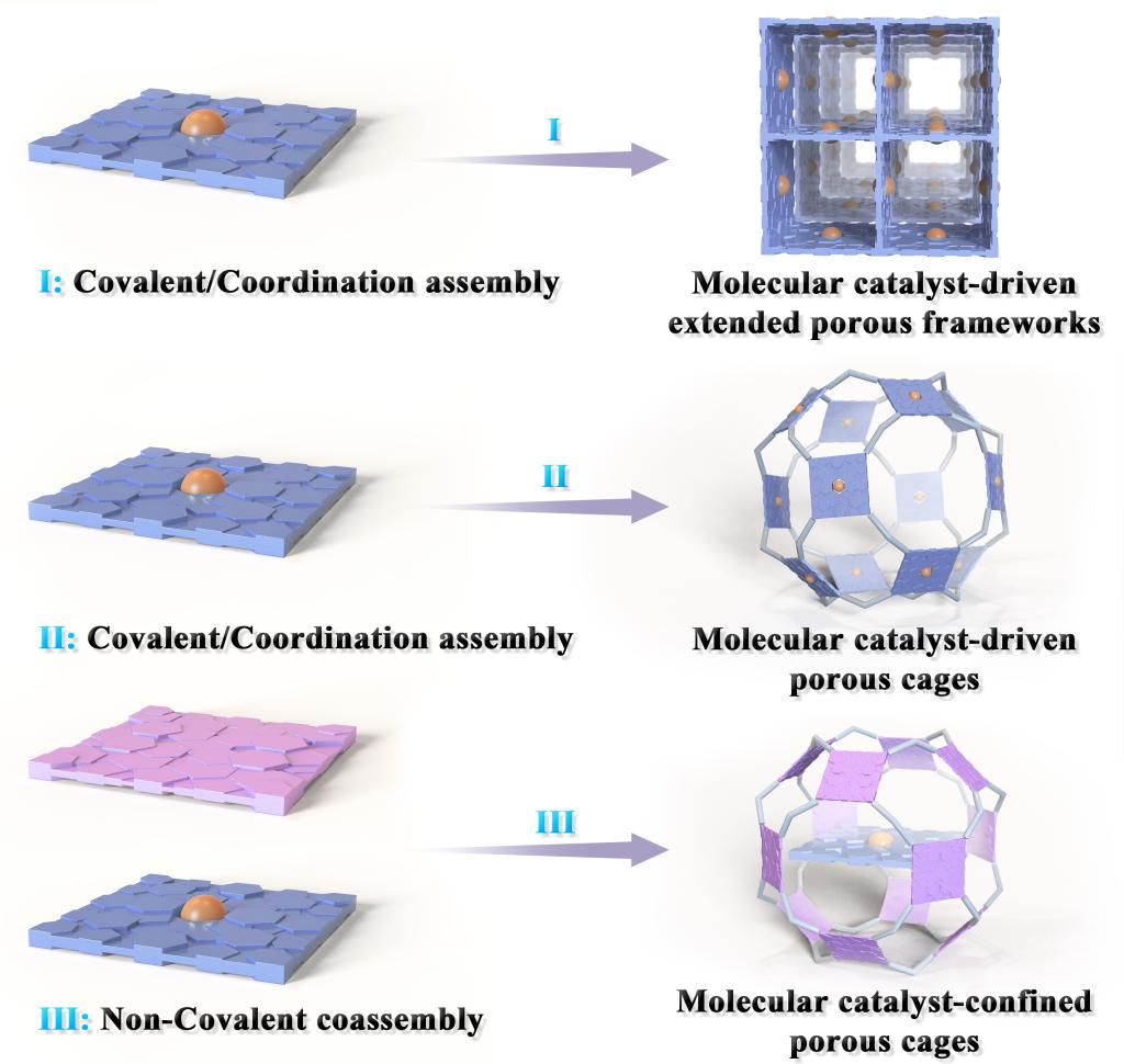 由金属中心和有机配体组成的分子催化剂,在过去的几十年中一直是化学和材料科学中最前沿的发展方向之一。由于分子催化剂中金属活性位点和分子配体的高度可设计性,它们的催化活性具有可调控性。然而,一些疏水性分子催化剂(例如酞菁和卟啉基有机催化剂),其在溶液中倾向于聚集,往往导致催化剂失活。从原理上分析,以下几种策略可以解决这个关键问题:首先,利用分子催化剂构建高度结晶的多孔材料,可以锚定活性位点(策略I),例如金属-有机框架(MOFs)和共价有机框架(COFs),极大地防止了活性位点的聚集,与其分子催化剂前驱体对比,自组装多孔框架的催化剂因其超高表面积、限域的孔道和可调结构而往往显示出较高的催化效率。然而,由于其它们固有的特性可能会妨碍底物和中间体在纳米孔道中的传质。其次,由分子催化剂构建的离散型超分子多孔有机或配位分子笼策略(策略II),这种策略可以有效克服策略I中存在的传质问题,这些金属笼超分子催化剂表现出优异的类酶活性,可用于化学转化。然而,用于构建这些纳米笼的配体多为芳香疏水结构,会不可避免地触发分子笼间的聚集,因此这些分子催化剂中对环境敏感的催化位点,在超分子催化过程中仍然不能完全被隔离,进而导致催化活性的损失。