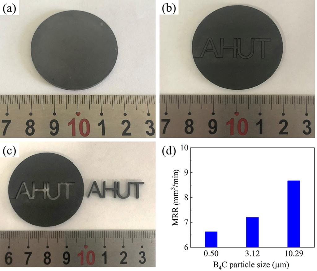 碳化硼(B4C)陶瓷作为一种重要的结构工程材料,在耐磨部件、研磨介质、轻质装甲、核屏蔽材料等领域具有广阔的应用前景。由于B4C陶瓷具有难烧结、超高硬度和本征脆性的特点,复杂形状致密B4C工程构件的性能及加工效率低、成本高昂。为了解决这一问题,团队设计、制备了B4C‒TiB2导电复相陶瓷。TiB2导电第二相不仅对B4C基体有良好的强韧化效果,而且极大地提升了其电导率,所制备的导电复相陶瓷可使用电火花加工技术进行快速加工。