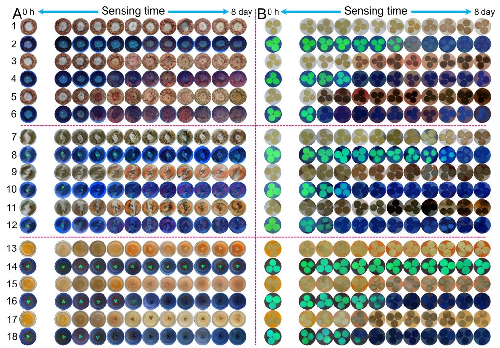 (基于颜色变化和荧光响应的非接触式食品新鲜度双模传感原理示意图)