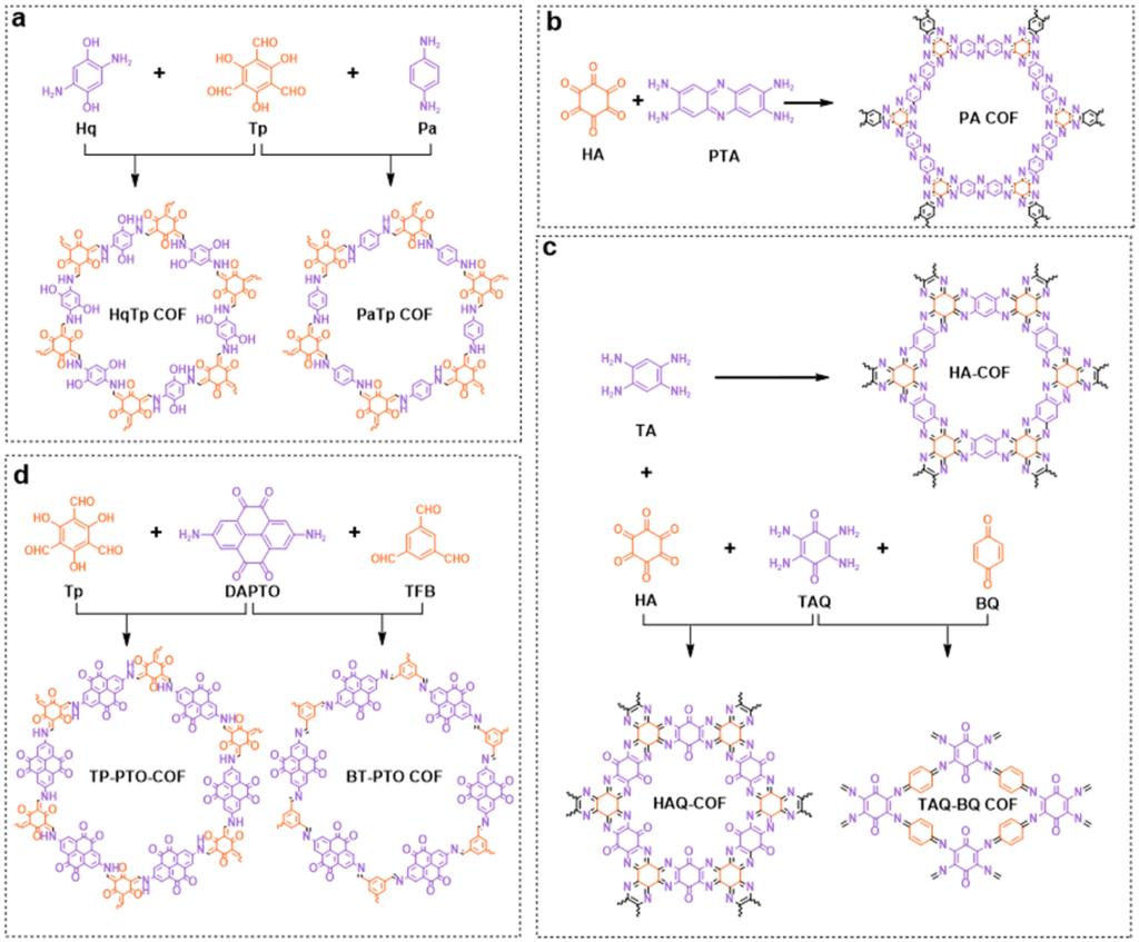 团队分析了COFs的化学可调性,以及在水性锌电池中基于COFs的正极、光响应正极材料、卤素电极材料基质和电催化剂作为锌-空气正极、负极、锌负极保护层、隔膜的最新进展,由于COFs的不溶性和坚固的框架,COFs电极在AZBs中也具有良好的结构稳定性。虽然COFs在AZBs体系中取得了一定的进展,但一些技术问题仍然限制了基于COFs的AZBs功能材料。团队系统地总结了特定结构的化学特征,包括将对这些COFs的化学性质进行分析,探讨其作为AZBs组分的具体化学设计并提出了几种改善策略,为高性能水系锌电池的COFs材料设计和研究提供了重要参考。