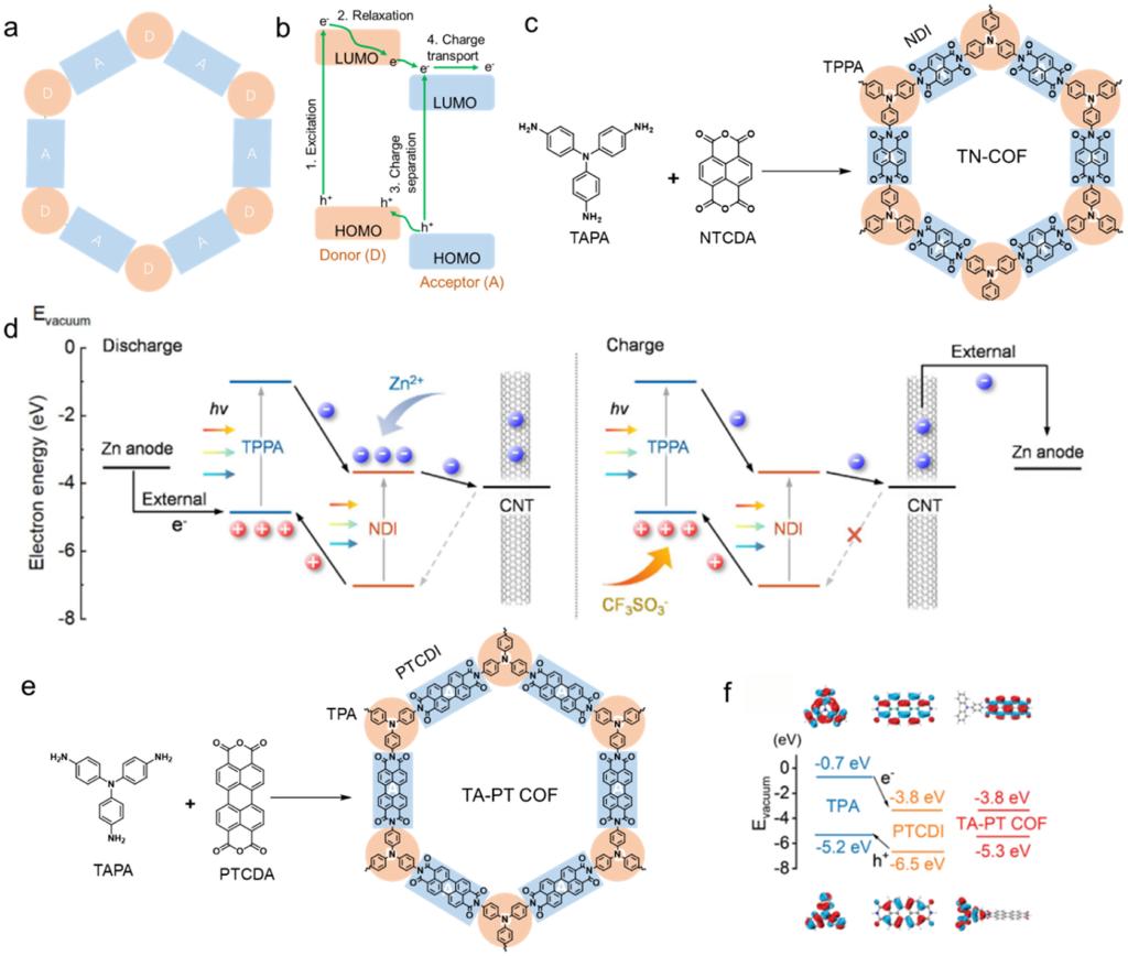 COFs作为正极材料可以解决有机分子的溶解问题,从而显著提高长期循环稳定性。硼环、烯烃、咪唑等连接基团难以作为储能活性位点,且会降低材料的整体比容量。只有富含吩嗪和亚胺、羰基官能团的可以作为储能位点的COFs作为正极材料才能够有较高的比容量。双功能COFs中电子给体和电子受体单位的周期性排列将促进电荷的分子间分离和传递。此类D-A-COFs作为光响应正极材料可以集光电转换功能和电化学氧化还原位点于一体,收集光后产生光电子和空穴,为氧化还原反应提供能量。作为隔膜或保护层的COFs,其极性基团不仅对Zn表面具有较高的吸附能力,而且可以调节Zn2+的透过率。孔内壁的周期性结构使COFs具有良好的调节作用,可以减缓Zn枝晶产生和H2的析出。