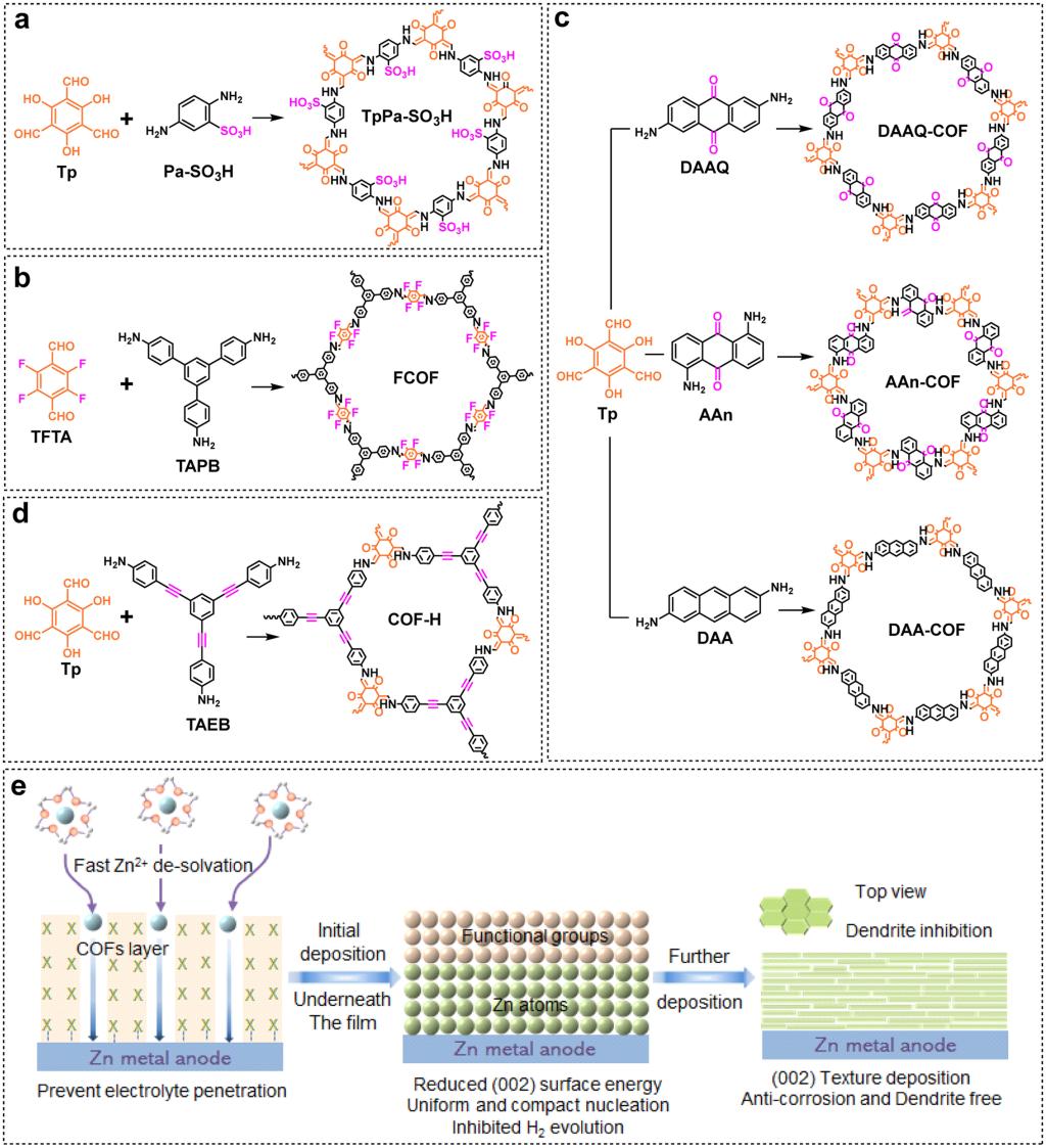 可充电水性锌电池(AZBs)已成为电网规模储能电池系统的理想选择之一。由于在充放电过程中正极材料的降解和锌负极的枝晶/腐蚀等原因,使其在实际应用中受到比能、循环稳定性和保质期等不理想因素的阻碍。在过去的几年里,共价有机框架(COFs)由于其可设计的分子结构、特殊的有序孔道和可调节的功能分子单元,已经被用于解决了水性锌电池中的固有问题。COFs由于有效储能组分的可行掺入和共价键结构的高稳定性,可以解决充放电过程中正极材料溶解的问题。通过建立基于COFs的界面层来均匀离子通量,提供更多的成核种子,抑制腐蚀反应,可以很好地延缓锌负极的枝晶和腐蚀问题。