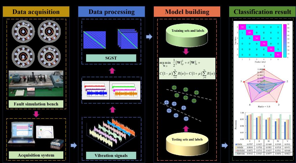 此外,为了解决设备故障诊断中数据不平衡时的分类问题,本研究提出了一种鲁棒光滑约束矩阵机(RSCMM)。RSCMM通过设计动态调整因子,可以根据不平衡率动态调整损失项系数,提高数据不平衡下的识别性能;设计了RoBoSS损失项,弱化了噪声的影响和提高了模型的收敛速度。相关研究成果发表在《Advanced Engineering Informatics》,beat365官网为论文唯一单位,机械工程学院潘海洋副教授为论文第一作者,郑近德教授为通讯作者,刘庆运教授、童靳于高级实验师、邓书朝为合作作者。