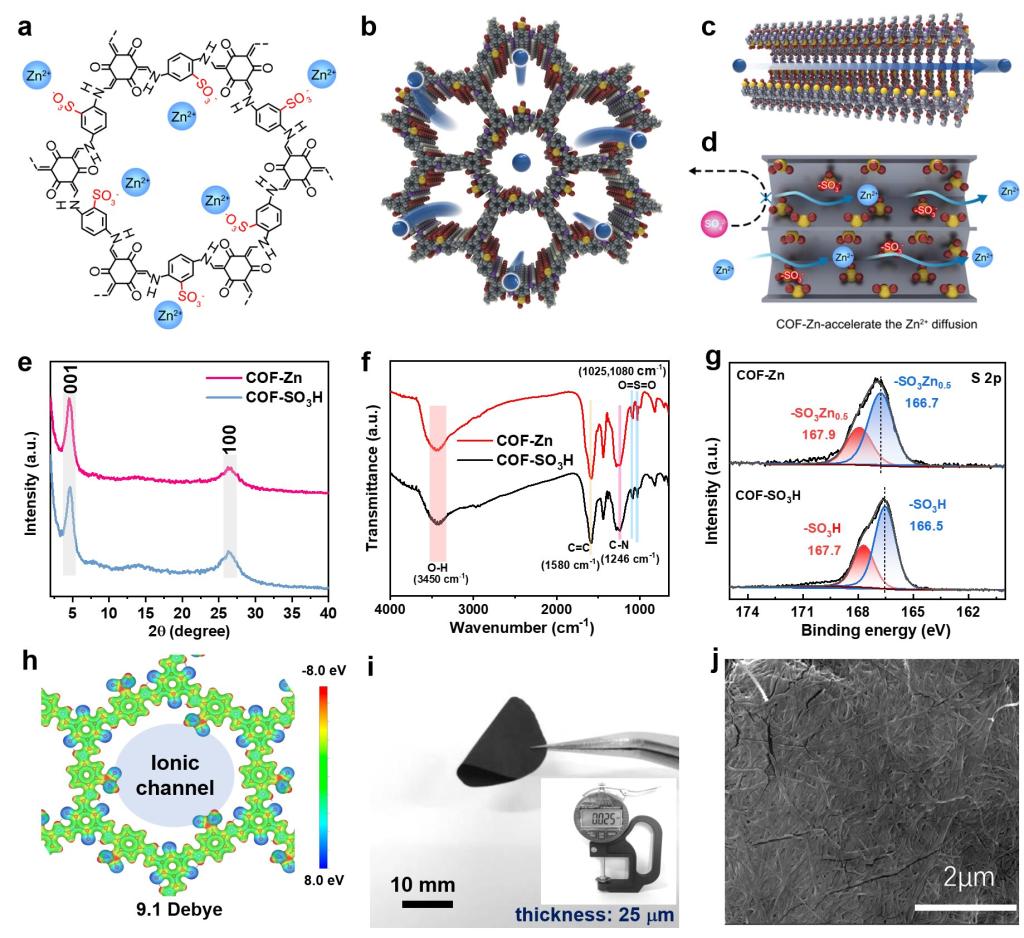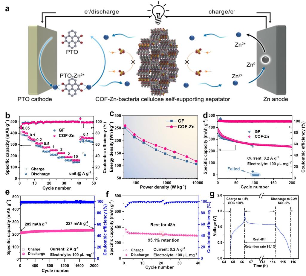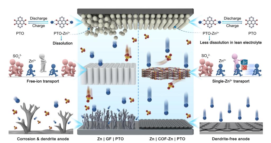 团队设计了一种具有准单离子导电性的共价有机框架(COF)的隔膜,采用锌离子取代的磺酸盐COF(COF-Zn)膜,该COF-Zn隔膜具有较高的锌离子迁移数(0.87)和薄至25 mm的厚度,能够减少电解液的使用量(20μL mg-1),同时有效减少阴极溶解。这种准单离子导电性和负电性特性通过降低水活性,同时改善了锌负极的稳定性。