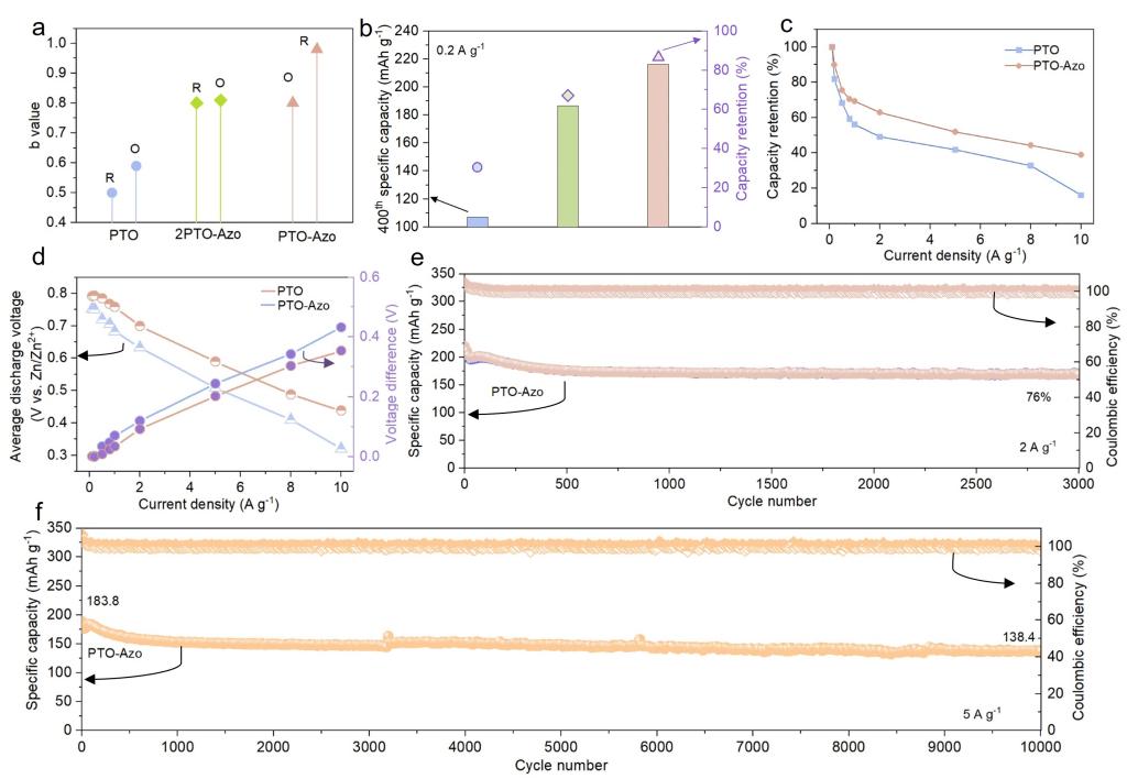 传统的羰基和亚胺基有机化合物基于其电子转移反应,容量和能量密度有限,因此亟需开发新型的具有多电子转换反应的官能团。有机硝基化合物基于其两电子氧化还原反应已在锂离子电池中表现出高达~500 mAh g−1的比容量,研究表明,每个硝基上的两个氧原子可同时与一个锌离子相结合,或每个氧原子分别结合一个锂离子。团队研究了硝基化对芘-4,5,9,10-四酮(PTO)的改善效应,实现了循环寿命和动力学的提升。在0.8-1.5 V电压范围内,硝基的吸电子效应可显著提高羰基基团的放电电压。在0.1-1.5 V电压范围内,硝基的四电子转移特征可提高首次放电容量,实现了905 mAh g⁻¹的超高比容量。该四电子反应对应于硝基向偶氮基的新型电化学转化,这一转化可原位构筑偶氮桥联的共轭多羰基有机电极材料(PTO-Azo),从而避免PTO在低电流下的快速溶解现象,实现循环稳定性的大幅提升。此外,偶氮链接的聚合物可显著降低未占据分子轨道能量和带隙,促进电子和离子传输,改善反应动力学。