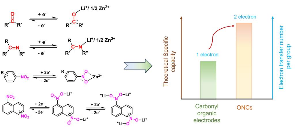 电子设备的飞速发展以及对可持续能源供应需求的增加,以可充电电池和氧化还原液流电池为代表的高性能储能技术得到迅速发展,这些电池的性能主要依赖于电极材料的氧化还原性能。因此,具有多电子氧化还原活性和快速反应动力学的电极材料是获取高性能的必要条件。有机电极材料可通过预设计氧化活性位点和分子结构调控,在电极材料上表现了很高的应用前景,如羰基和亚胺基在电池中可展现可逆的一电子氧化还原反应。更为突出的是,硝基具有两电子氧化还原活性,在电池中可输出更高的比容量。除用作电化学活性位点外,硝基具有强吸电子基团,可显著改善有机材料的氧化还原电势和输出电压平台。因此有机硝基化合物(ONC)是一种有吸引力的替代品,它具有多电子氧化还原过程和通过结构修饰可调节电池性能的优点。