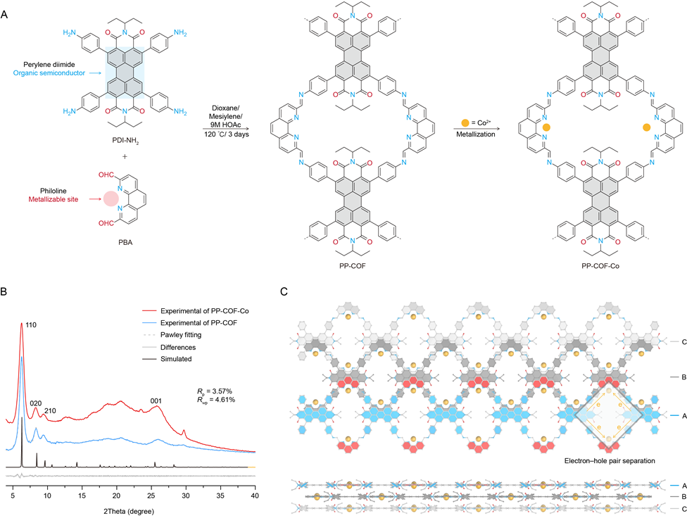 团队以苝二酰亚胺(PDI)为光敏单元,1,10-菲咯啉为金属配位位点,通过溶剂热聚合构建了一维ABC堆叠结构的共价有机框架(PP-COF),并进一步通过后合成金属化引入钴离子,获得PP-COF-Co。通过X射线衍射、X射线光电子能谱和氮气吸附等表征手段,证实了材料的高结晶性、均匀的钴配位环境以及微孔结构。理论计算与实验分析表明,钴的引入显著增强了π共轭体系的电子离域性,将材料带隙从1.99 eV降至1.61 eV,并通过d-π轨道协同效应促进光生电子-空穴对的高效分离,单线态氧(¹O₂)生成速率提升至4.67μM/s,较未金属化材料(2.33μM/s)实现倍增。