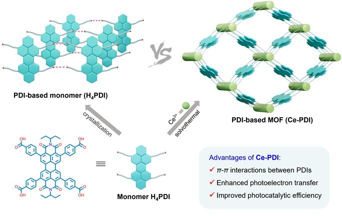 针对苝二酰亚胺(PDI)材料易发生电荷复合和聚集淬灭的难题,团队创新性地设计并合成了一种新型双壁多孔金属-PDI框架(Ce-PDI)。通过将PDI配体与铈离子自组装构建三维多孔结构,利用强π-π堆叠作用稳定PDI单元,显著提升电荷分离效率和催化稳定性。实验表明,Ce-PDI在可见光驱动下可实现吲哚C-3甲酰化(产率95%)和苯并咪唑合成(产率97%),催化效率较氢键组装体(H4PDI)提升3倍以上,且循环使用5次后结构保持完整。研究结合单晶衍射、瞬态吸收光谱等技术揭示了材料的高效电荷传输机制,并通过电子顺磁共振证实活性氧物种的关键作用,为设计高性能光催化剂提供了实验依据和理论支撑。相关研究成果发表在国产化学权威期刊《Science China Chemistry》上,化学与化工学院青年教师马莉莉和硕士生杨斐年为共同第一作者,化学与化工学院袁国赞教授、河南师范大学夏庆春和西北大学韩英锋教授为共同通讯作者。