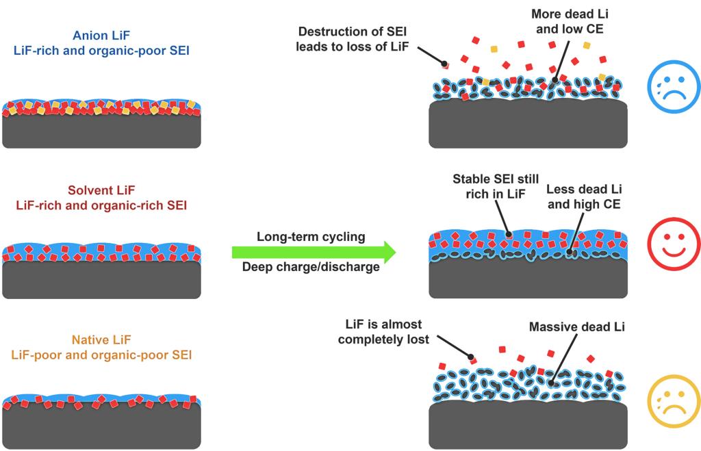 (三种含LiF界面对锂电池长循环的作用效果示意图)