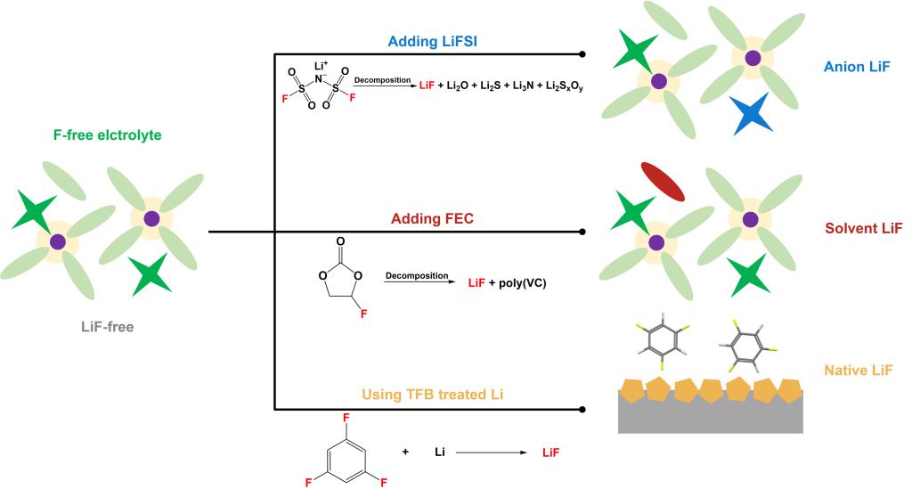 (在无氟体系中引入不同氟源得到三种含LiF界面示意图)
