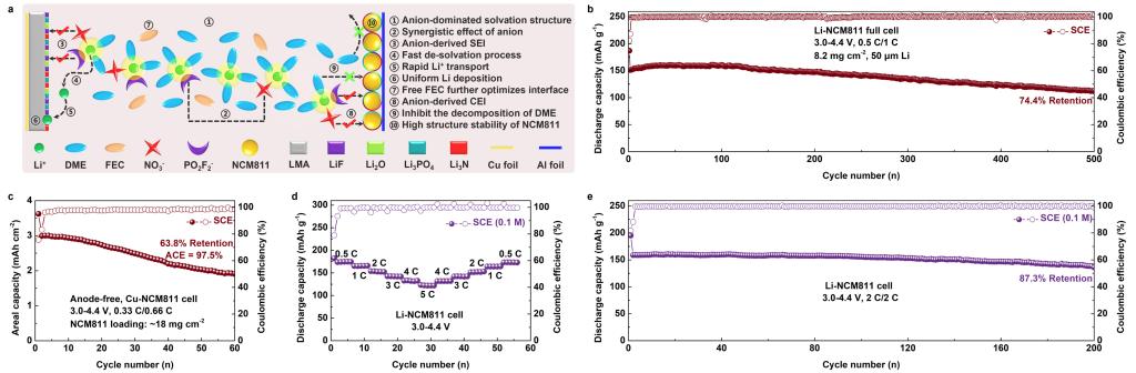 (SCE对高压锂金属电池的作用机理示意图及电化学性能测试)