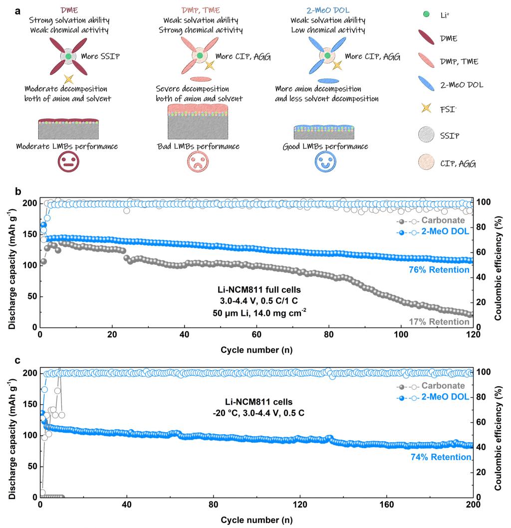 (弱溶剂化电解液对锂电池的作用效果示意图及电化学性能测试)