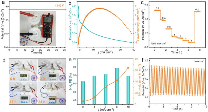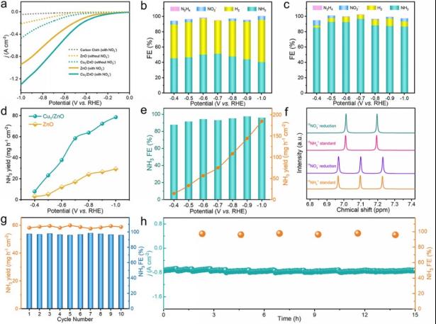 为了解决这一难题,曾杰教授团队开发了一种ZnO载体分散的Cu单原子合金氧化物催化剂(Cu1/ZnO)。该催化剂体系中,原子级分散的Cu位点增强了对硝酸根中间体(*NO3)的吸附,Cu位点协同ZnO载体中Zn位点促进了水解离生成活性氢并且抑制了活性氢脱附生成H2析出,从而为*NO3的加氢过程提供了充足的质子源,降低了反应速控步(*NO加氢生成*NHO)的能垒。最终实现了安培级电流密度(2.2 A cm-2)、高选择性(96.1%)、高产率(184.7 mg h-1 cm-2)电催化硝酸盐还原合成氨。此外,将Cu1/ZnO催化剂应用于可充电的Zn-NO3-电池,可以稳定的输出高达1.5 V的电压和5.5 mW cm-2的峰值功率密度,展现出了良好的应用潜力。