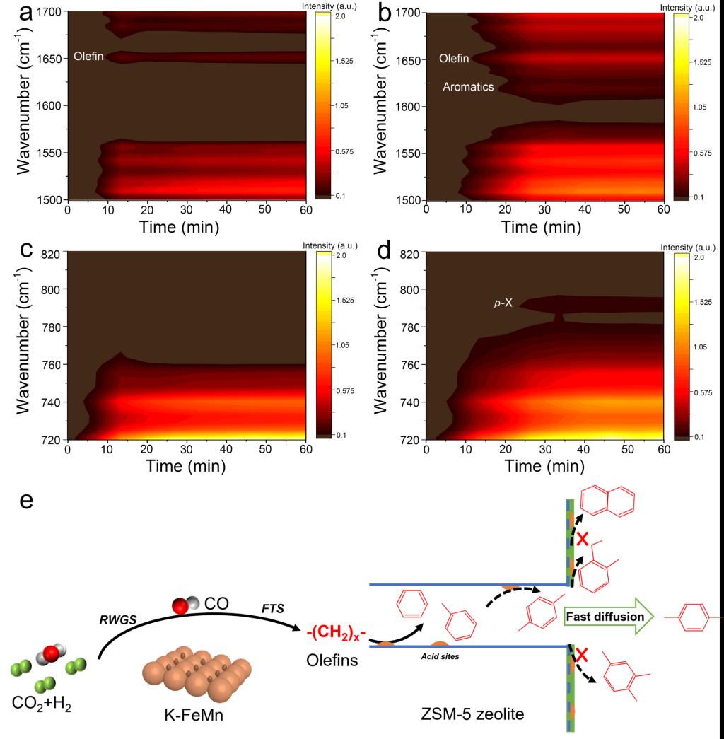 机理研究表明,钾和锰改性的铁基材料促进了轻烯烃中间体的形成,而中空结构ZSM-5具有钝化的外表面酸位点,能有效抑制对二甲苯的异构化和烷基化反应并能促进对二甲苯的扩散,使二甲苯中对二甲苯比例达到65.1%。本研究通过特定催化剂设计和空间分离工艺,克服了局部热力学平衡,为可持续且高效的对二甲苯生产开辟了新途径。