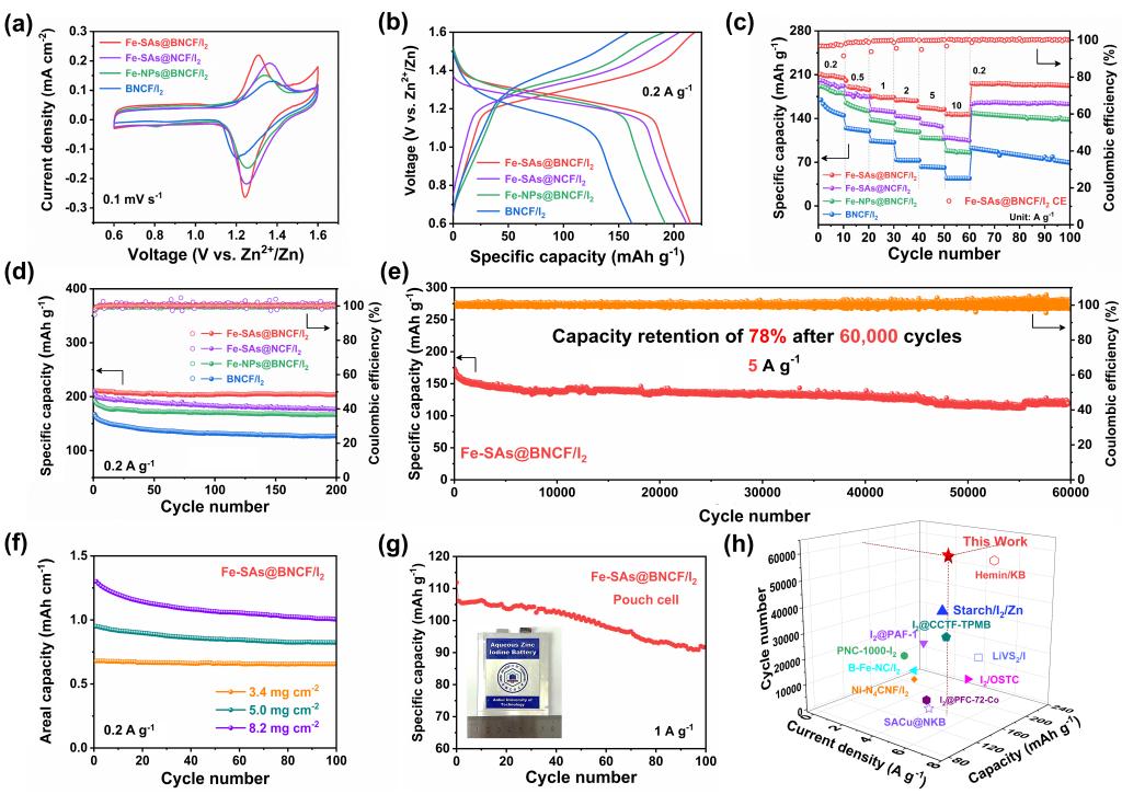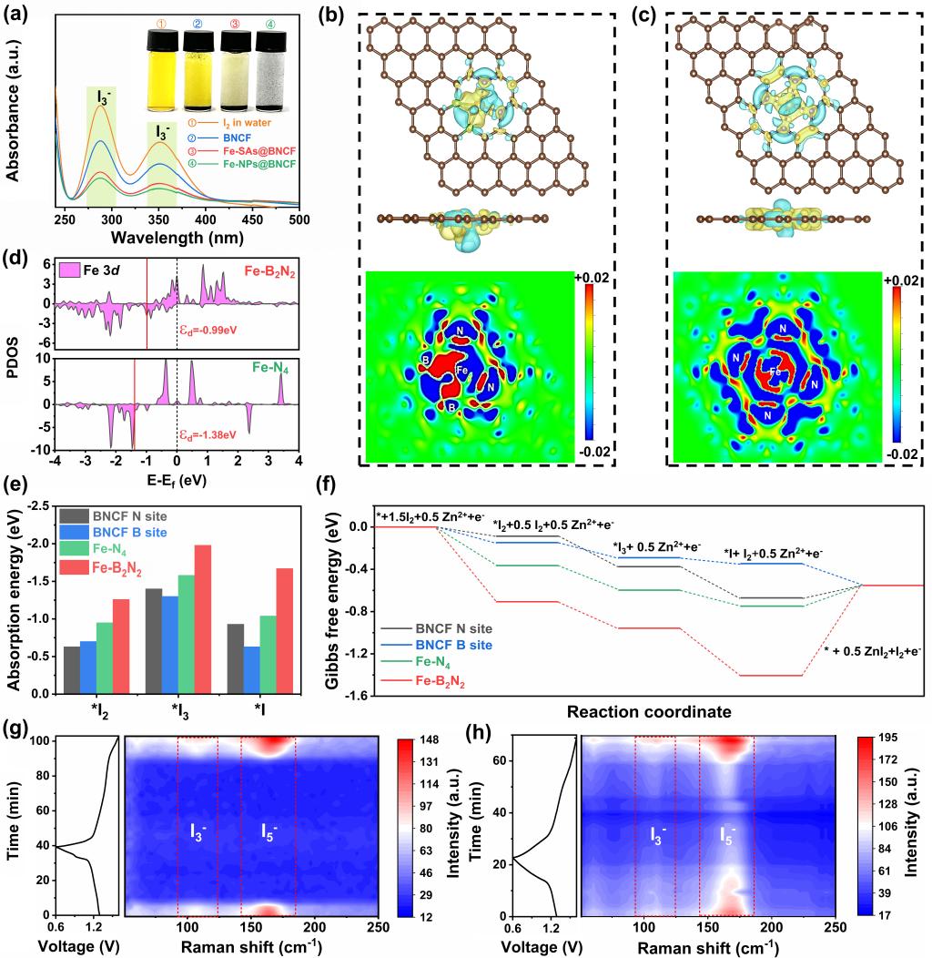 本研究通过一锅煅烧法成功制备了Fe-B2N2单原子修饰的碳纳米管森林(Fe-SAs@BNCF)材料。该材料通过B、N不对称配位,利用B原子弱电负性特点,有效提升了中心铁单原子电子云密度,增强了对聚碘化物的吸附和催化性能;同时,碳纳米管森林自支撑结构丰富的孔隙,显著提高了正极碘负载量。DFT计算表明,相比传统的FeN4结构,B位点的引入打破了Fe原子对称电子分布,降低了碘还原反应能垒。基于Fe-SAs@BNCF组装的锌碘电池性能优异:在5 A g⁻1电流密度下循环60000次后,容量保持率达78%;10 A g⁻2时比容量为147.2 mAh g⁻2;碘载量为8.2 mg cm⁻2时,面积比容量达1.3 mAh cm⁻2。研究成果揭示了杂原子配位单原子催化剂在锌碘电池中的作用机制,为高性能水系储能器件的研发提供了新思路。