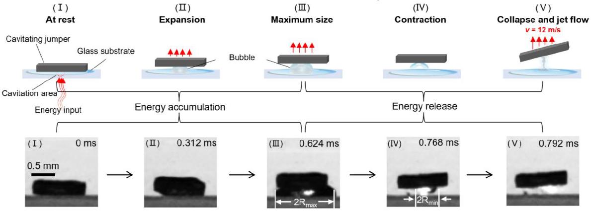 空化(Cavitation)通常指液体在低压或高温区域产生蒸汽泡的现象,气泡在溃灭瞬间可释放巨大能量,而传统上认为空化具有一定的破坏性,会对水力机械产生空蚀。本研究通过精确调控,利用光照可将空化效应转化为一种高效的动力来源,用于驱动微型执行器与机器人系统。在基于空化效应的高效、爆发式驱动机制下,我们成功展示了其在微型跳跃与游泳机器人以及多种仿生应用中的卓越性能。研究表明,气泡在剧烈溃灭过程中可产生强大反冲驱动力,在808 nm近红外激光(0.357 kW/cm2)照射下,一个毫米尺度(1mm×1mm×0.2mm,质量0.778mg)的高分子复合材料最快的运动速度可达12 m/s,加速度高达7.14×104m/s2,跳跃高度达1.5米,能量转换效率为0.64%。该器件还可实现水面游泳,速度达12 cm/s。