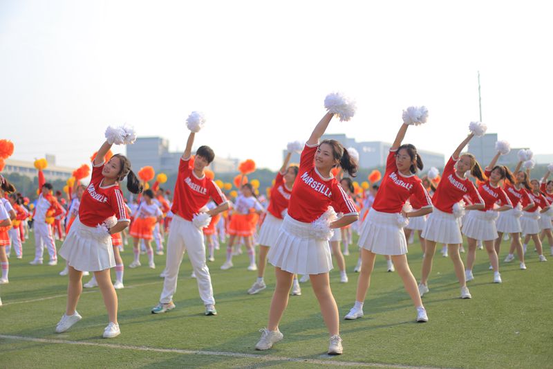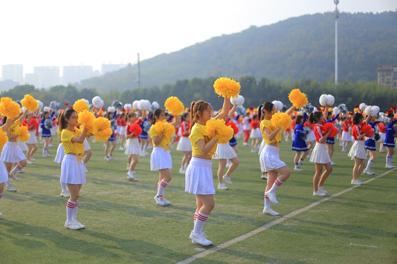 开幕式后,全校14个学院900余名同学参加大型团体啦啦操《我和我的祖国》表演。
