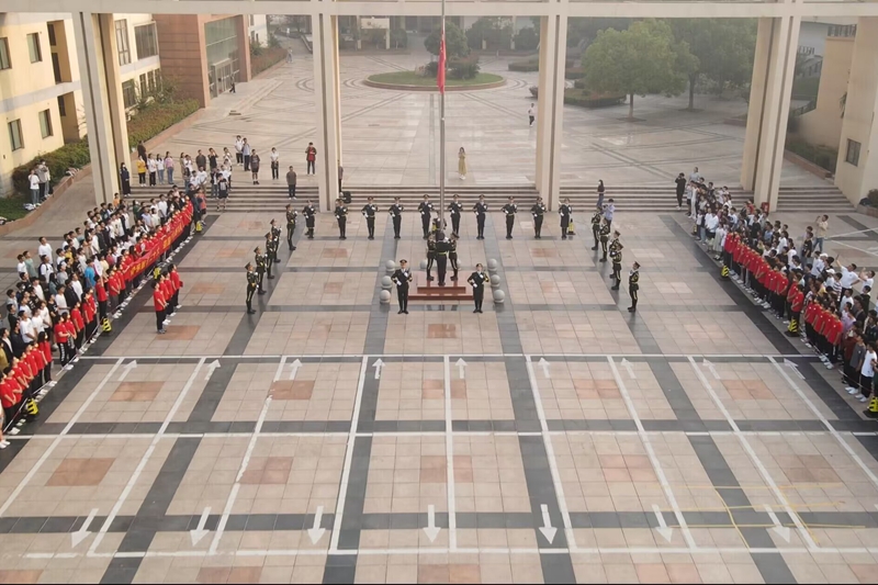 清晨七时整,校国旗护卫队的同学们迈着整齐划一、铿锵有力的步伐,护送着五星红旗正步走向旗杆。全体师生面向国旗肃立致礼,齐唱国歌,师生们注视着五星红旗冉冉升起,在熠熠晨光中迎风飘扬。