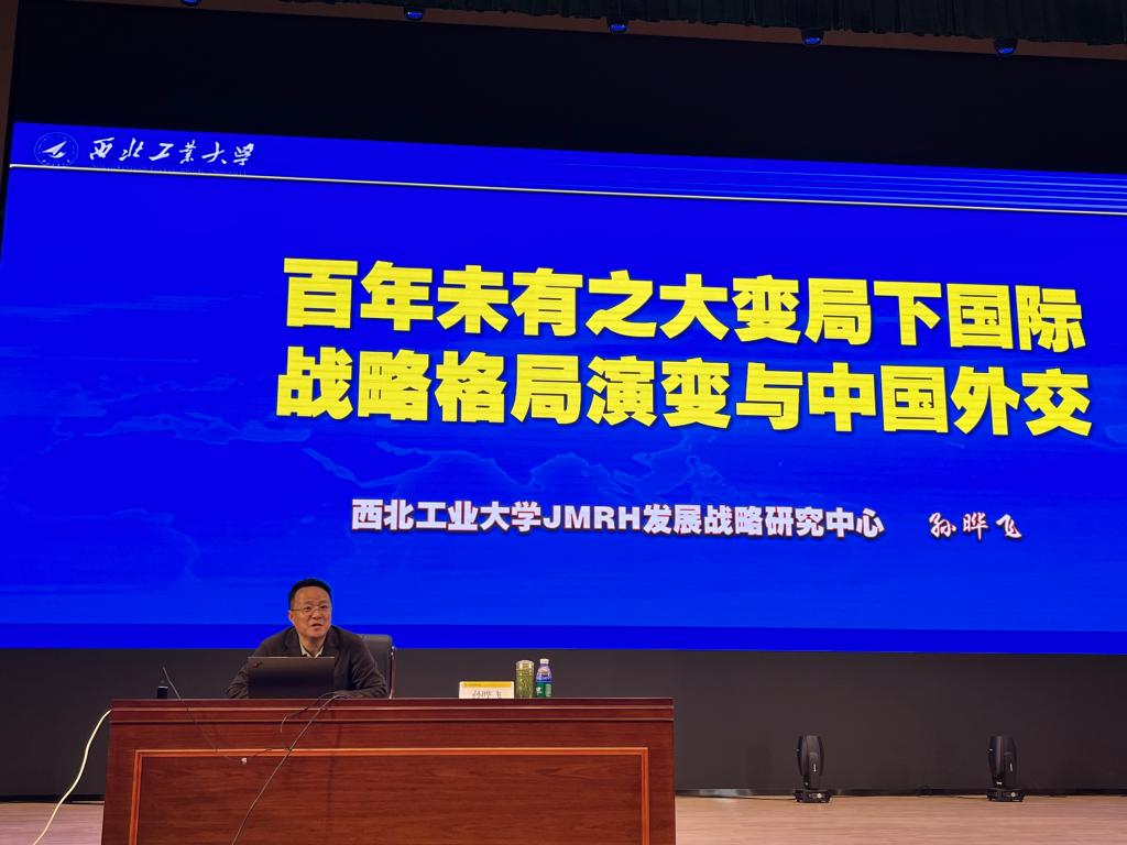 10月9日下午,beat365成功举办“明德大讲堂”第五十讲,邀请西北工业大学国防动员研究中心主任孙晔飞教授作了题为“百年未有之大变局下国际战略格局演变与中国外交”的专题讲座。此次讲座由马克思主义学院主办,党委组织宣传部和校团委协办,全校师生800余人参加,讲座由马克思主义学院与通识教育学院党委书记王君涛主持。