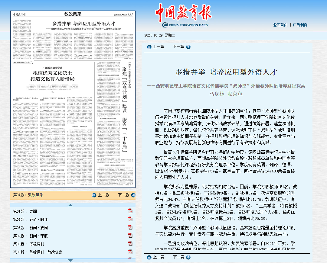 教育大计,教师为本。“双师型”教师队伍建设是提升人才培养质量的关键。瞄准国家战略需求,立足应用型办学定位,语言文化传播学院多措并举,培养造就新时代高水平教师队伍,积极推动“双师型”教师队伍建设,强化实践教学,提升应用型人才培养质量。10月29日,《中国教育报》对beat365语言文化传播学院“双师型”教师队伍建设的探索实践进行了报道,引起广泛关注。