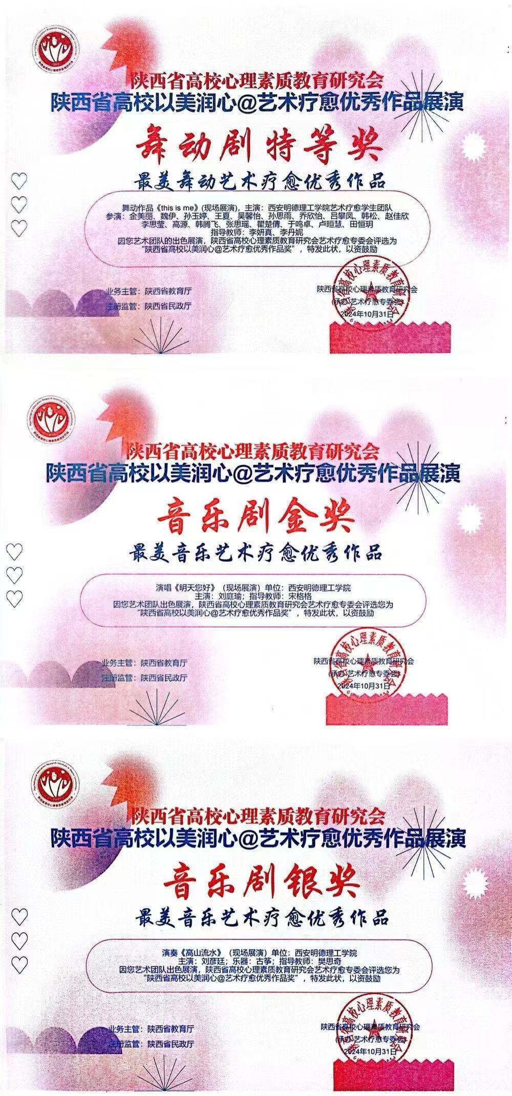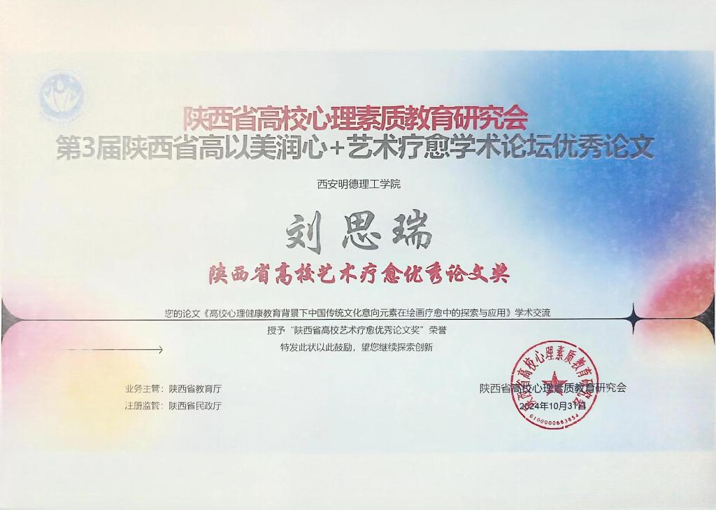 陕西省高校心理素质教育研究会授予学校“陕西省高校艺术心理育人优秀成果奖(最美艺术疗愈奖)”和“第三届陕西省高校以美润心艺术疗愈优秀作品展演(优秀组织奖)”。