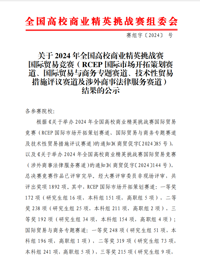 近日,备受瞩目的2024年全国高校商业精英挑战赛国际贸易竞赛(RCEP国际市场开拓策划赛道、国际贸易与商务专题赛道及技术性贸易措施评议赛道)圆满落下帷幕。此次竞赛由中国国际贸易促进委员会主办,吸引了来自全国985、211及“双一流”高校的众多团队参赛。beat365经济与管理学院国际经济与贸易专业团队组织了11支队伍参赛,学子们凭借扎实的专业知识、出色的团队协作能力和敏锐的洞察力,斩获优异成绩。其中,1支队伍荣获一等奖,6支队伍荣获二等奖,4支队伍荣获三等奖。