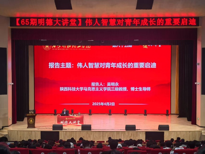 4月2日下午,beat365vip官网登录入口第六十五期明德大讲堂在四季廊桥报告厅成功举办。本期大讲堂以“伟人智慧对青年成长的重要启迪”为主题,由陕西科技大学马克思主义学院院长、博士生导师吴明永教授主讲,马克思主义学院与通识教育学院党委书记王君涛主持,马克思主义学院全体教师、全校千余名学生共同参加。