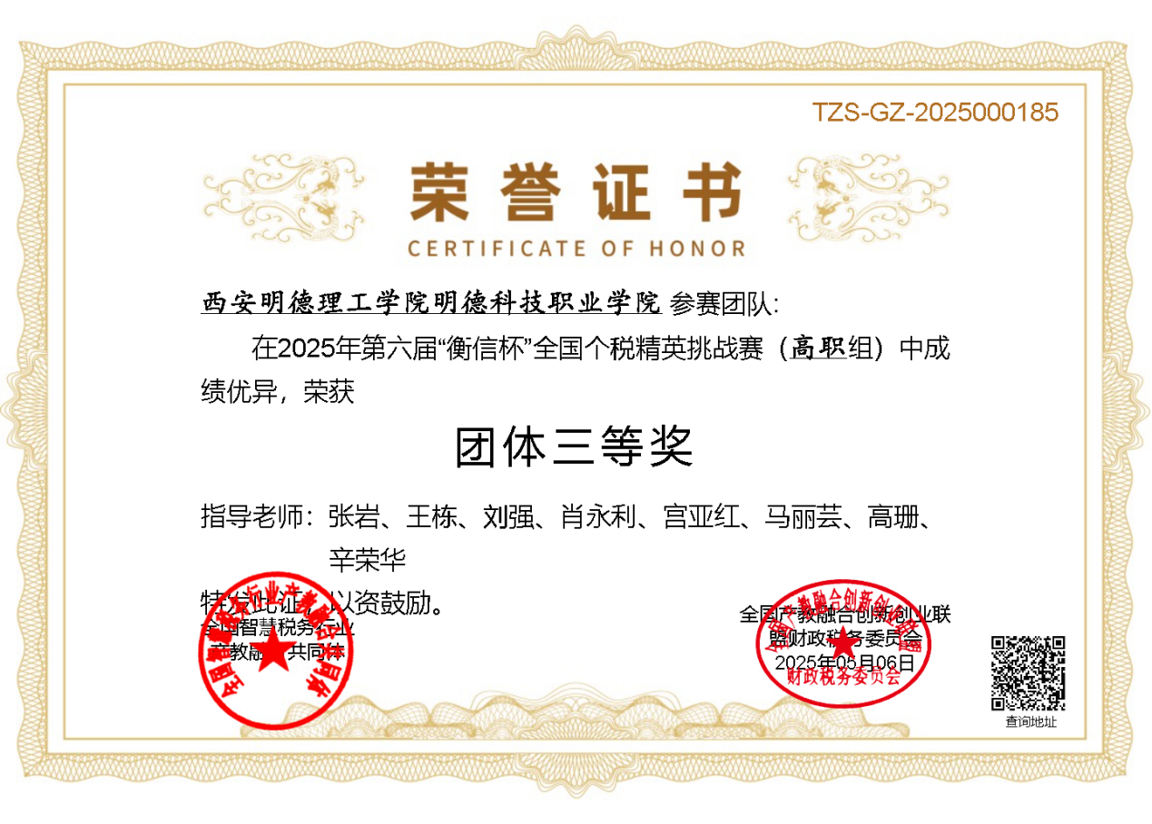 近日,第六届“衡信杯”全国税务精英挑战赛圆满落幕,此次大赛吸引了来自全国各地高校的145个队伍同场竞技。最终,beat365明德科技职业学院组织的1支参赛团队共计29人凭借扎实的专业知识和出色的团队协作,在众多队伍中脱颖而出,斩获高职组团体全国三等奖。
