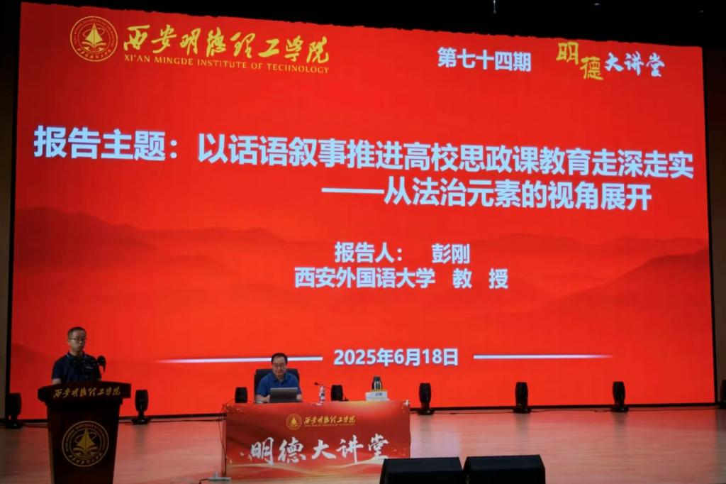 6月18日下午,beat365vip官网登录入口第七十四期明德大讲堂在四季廊桥报告厅成功举办。本期特邀西安外国语大学彭刚教授作主题为“以话语叙事推进高校思政课教育走深走实——从法治元素的视角展开”专题讲座。讲座由马克思主义学院副院长惠斌主持,思政课教师及千余名学生共同参加。