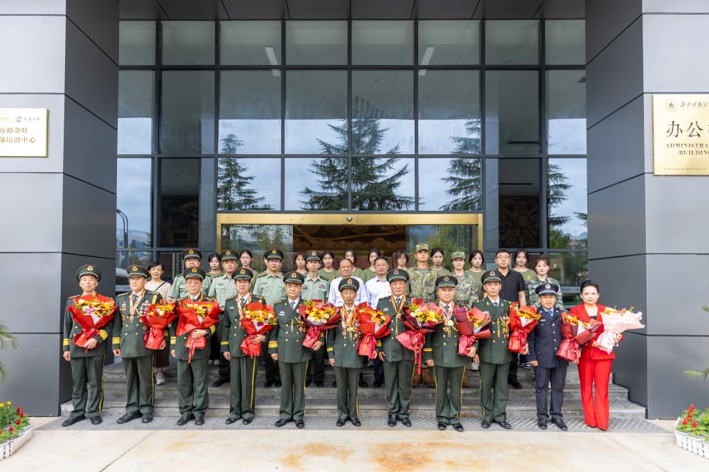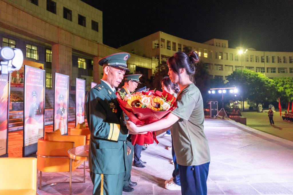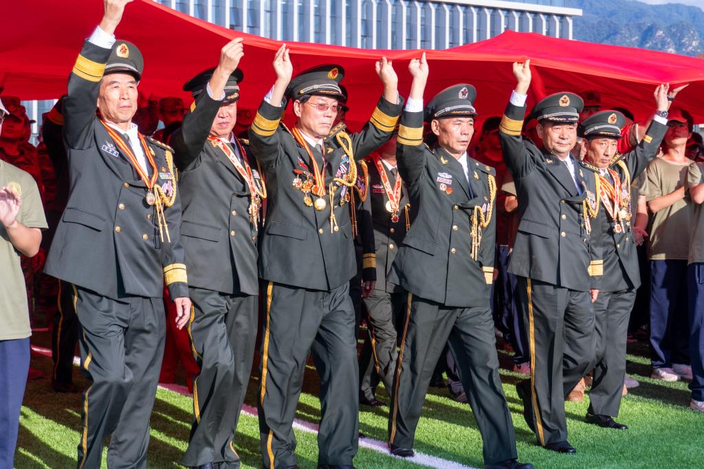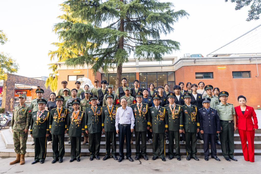 “银发宣讲团”以“五老”群体为核心,由翟学荣、牛先民、马玉革、马权斌、汪勇等多位英雄模范组成,他们兼具丰富人生阅历与深厚爱国情怀。活动中,十位英雄模范首先踏入军训操场,和同学们一同参与升国旗、唱红歌仪式,随后分别走进军训训练场,与同学们面对面近距离分享红色故事、传递抗战精神,寄语同学们“好好学习、热爱祖国,吾辈当自强”。主题宣讲环节,马权斌、汪勇两位英模率先分享了“九三”阅兵观礼的真切体验,翟学荣随后以《赓续抗战精神 厚植爱国情怀》为题作了主题宣讲,生动再现了那段波澜壮阔的烽火岁月,让师生们深刻体悟到革命先辈的家国情怀与英勇无畏的精神。