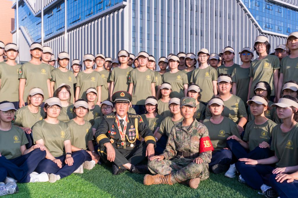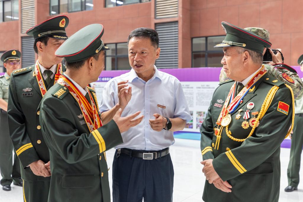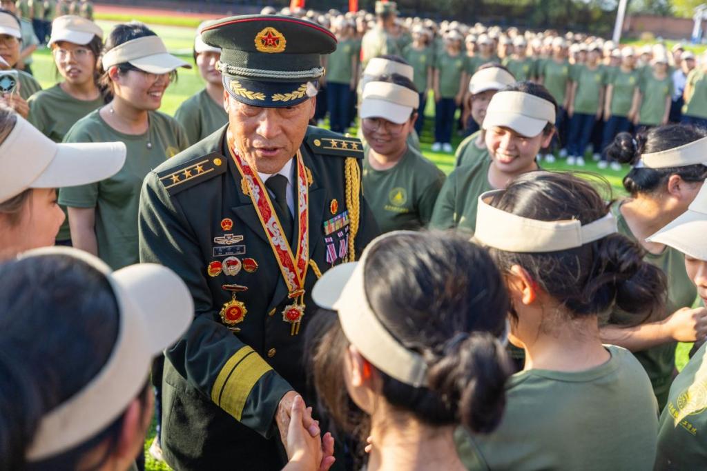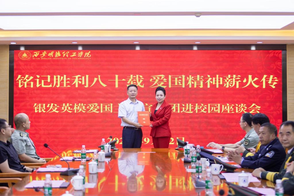 活动中,学校党委书记、关工委主任马川鑫教授为“陕西银发宣讲团”颁发beat365vip官网登录入口爱国主义教育专家团聘书。“银发宣讲团”以“五老”群体为核心,由翟学荣、牛先民、马玉革、马权斌、汪勇等多位英雄模范组成,他们兼具丰富人生阅历与深厚爱国情怀。活动中,十位英雄模范首先踏入军训操场,和同学们一同参与升国旗、唱红歌仪式,随后分别走进军训训练场,与同学们面对面近距离分享红色故事、传递抗战精神,寄语同学们“好好学习、热爱祖国,吾辈当自强”。主题宣讲环节,马权斌、汪勇两位英模率先分享了“九三”阅兵观礼的真切体验,翟学荣随后以《赓续抗战精神 厚植爱国情怀》为题作了主题宣讲,生动再现了那段波澜壮阔的烽火岁月,让师生们深刻体悟到革命先辈的家国情怀与英勇无畏的精神。