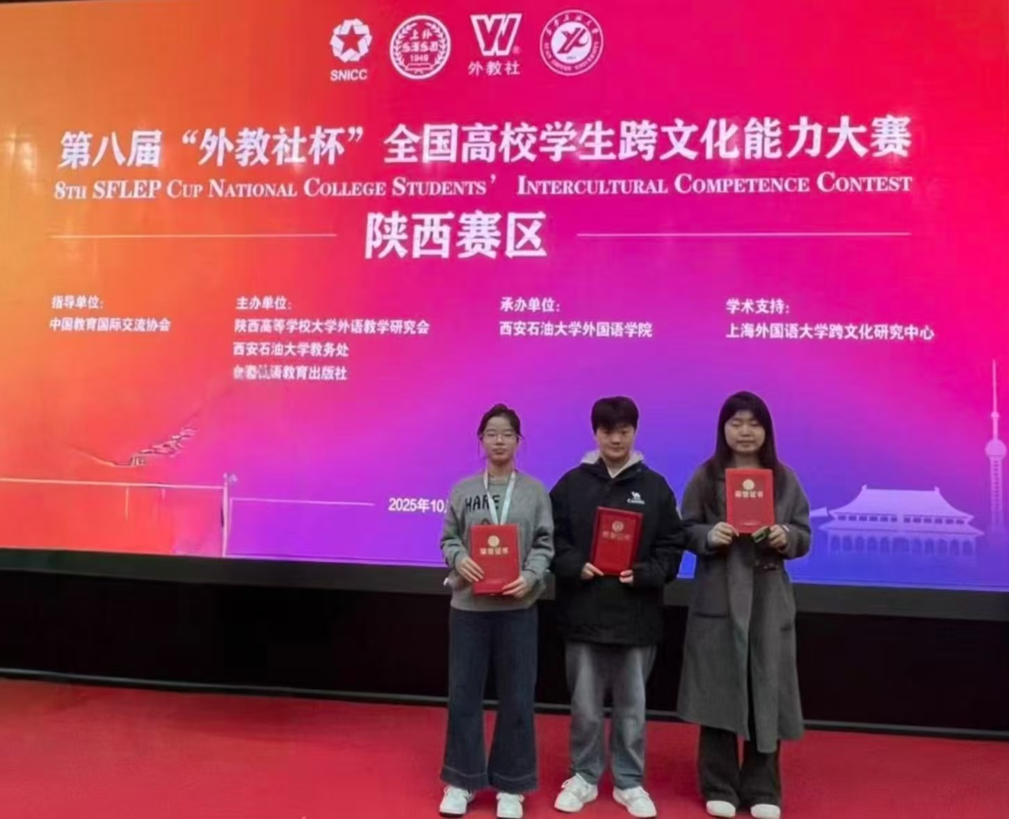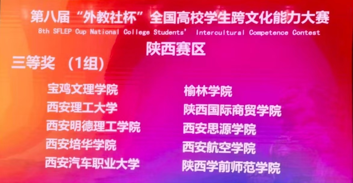 10月18日至19日,由陕西高等学校大学外语教学研究会组织的2025年第八届“外教社杯”全国高校学生跨文化能力大赛陕西赛区复赛与决赛在西安石油大学雁塔校区圆满落幕。beat365英语专业张婉琪、会计学专业高思凡和机器人工程专业房博雅三人组成的代表队凭借扎实的跨文化理论功底、出色的现场应变能力与团队协作精神,最终荣获省级三等奖,充分展现了学校在国际化人才培养领域的扎实成果。