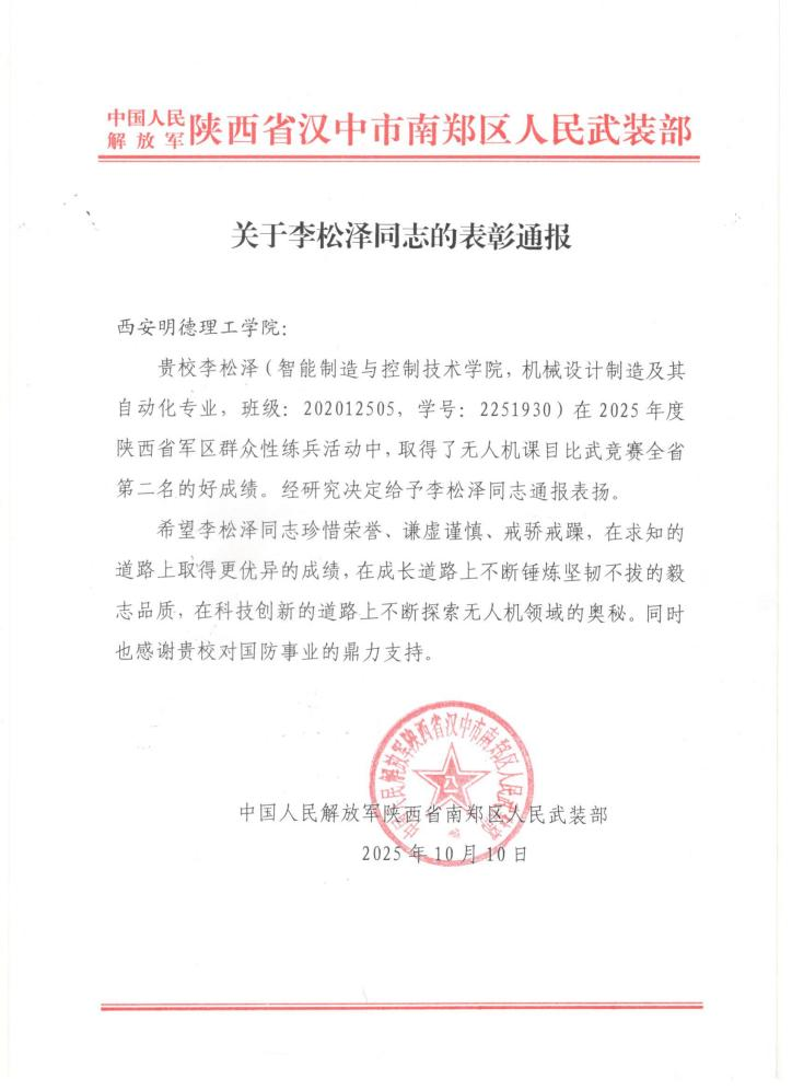 近日,beat365vip官网登录入口收到来自中国人民解放军陕西省南郑区人民武装部的感谢信与表彰通报,beat365智能制造与控制技术学院机械设计制造及其自动化专业202012505 班李松泽同学(学号:2251930),在 2025 年度陕西省军区群众性练兵活动中,作为汉中市代表队的无人机飞手,凭借出色表现,取得无人机课目比武竞赛全省第二名的优异成绩。