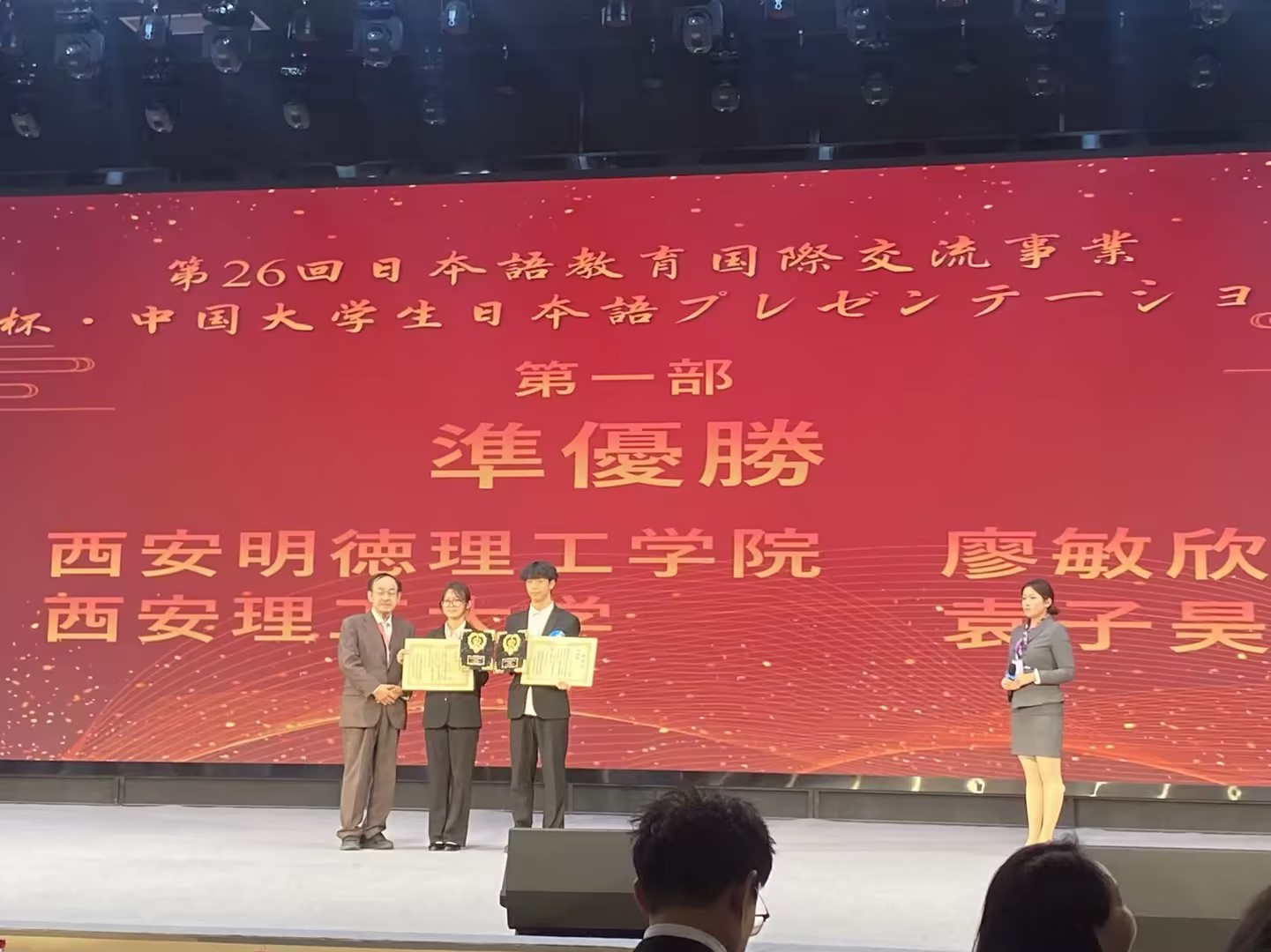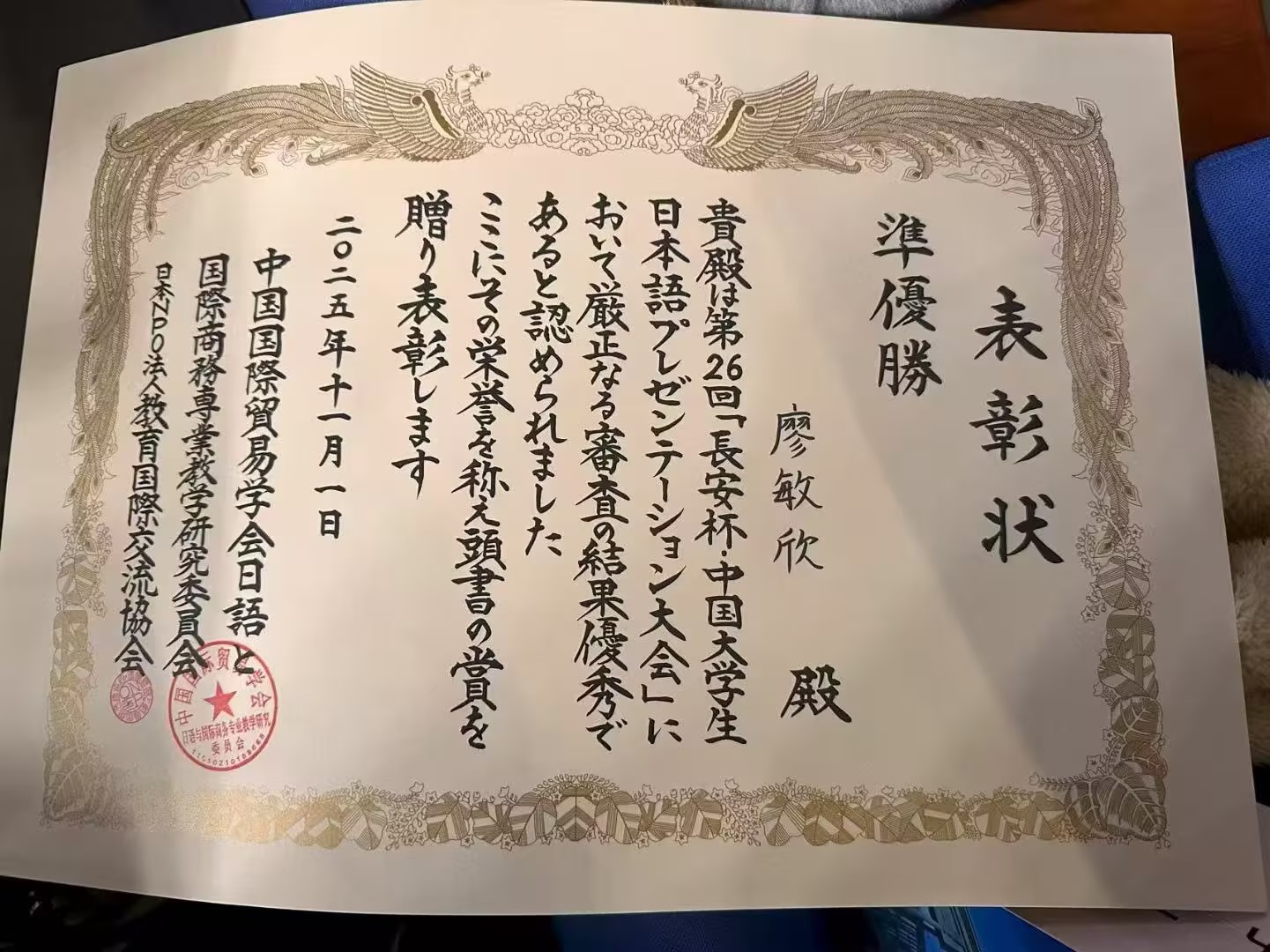 近日,第26届“长安杯”中国大学生日语才能演示大赛圆满落幕。beat365vip官网登录入口语言文化传播学院日语专业2023级学生廖敏欣凭借扎实的语言功底与出色表现,斩获甲组亚军;指导教师张翔获评优秀指导教师奖,彰显了beat365日语专业的教学实力与人才培养成效。