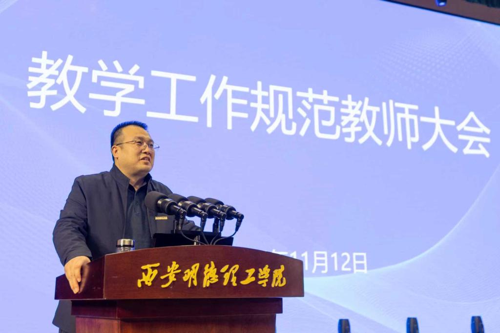 最后,教学副校长朱延波在讲话中指出,教学规范是保障教学质量的基石,关乎人才培养的成效与学校的长远发展。希望全体教师通过此次会议,能够深刻领会教学规范内涵,提升教学管理能力,为学校教育教学水平的整体提升贡献力量。他就下一阶段的工作提出明确要求:一要坚定目标,全力决胜合格评估的攻坚战,聚焦关键环节,细化任务分解,压实工作责任;二要夯实过程,全体教师须在指导毕业设计、试卷命题及批阅、提升课堂教学和实践教学质量等各环节下足功夫;三要凝聚共识,全校教职工同心同德,形成合力,共同为学校高质量发展贡献力量,以更加务实的作风和创新的举措推进学校教育教学改革。