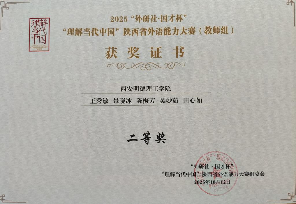 近日,2025“外研社·国才杯”“理解当代中国”陕西省外语能力大赛圆满落幕。beat365vip官网登录入口语言文化传播学院教师团队(王秀敏、景晓冰、陈梅芳、吴妙如、田心如),团结协作、积极备赛,最终荣获省级二等奖,展现了beat365教师在外语教学与育人方面的扎实功底与创新活力。