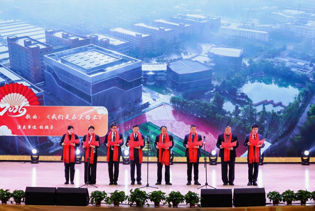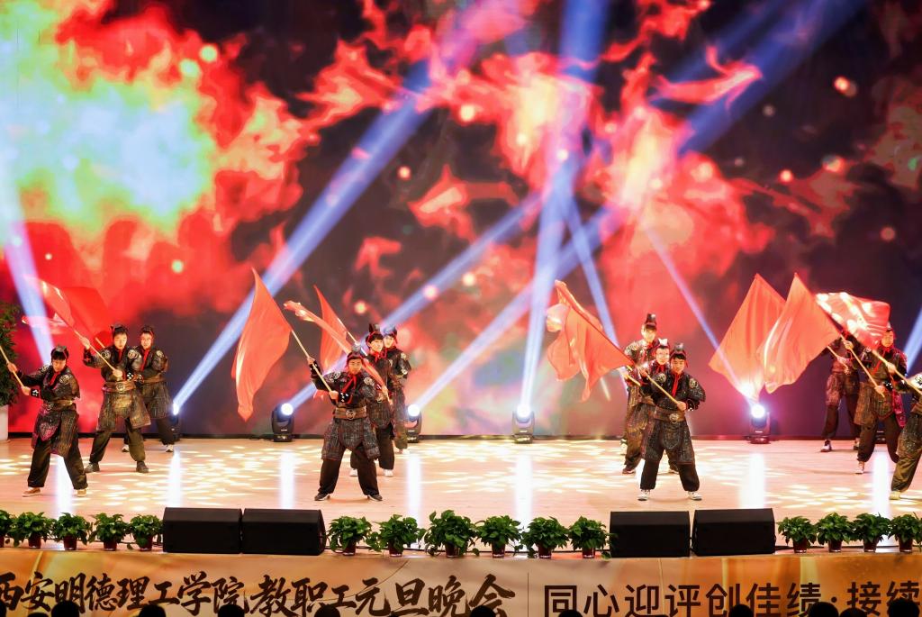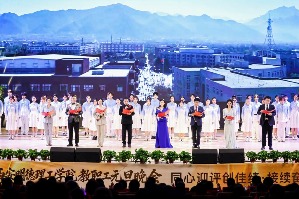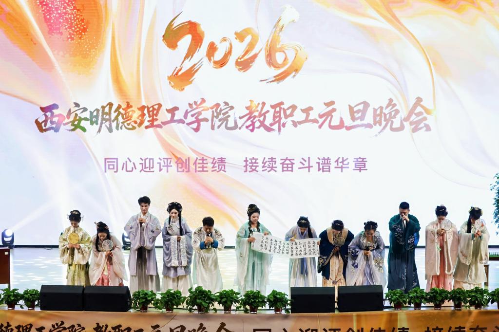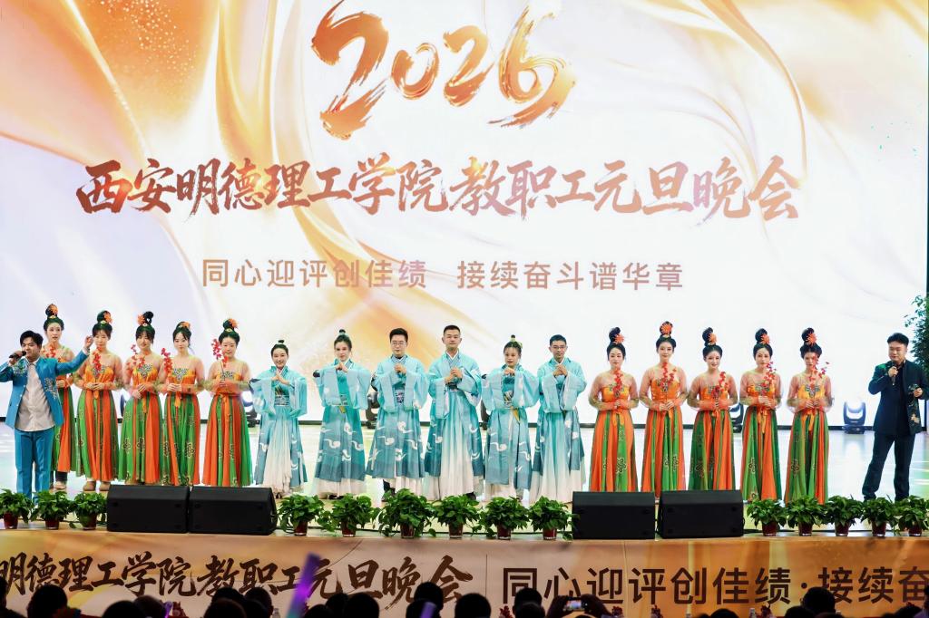 12月30日晚,学校四季廊桥报告厅灯火璀璨、暖意浓浓,以“同心迎评创佳绩·接续奋斗谱华章”为主题的2026年教职工元旦晚会隆重举行。陕西金叶科教集团领导、明德源教育集团领导、学校领导班子成员与全校教职工欢聚一堂,共迎元旦佳节,为学校本科教学工作合格评估凝心聚力、鼓劲加油。