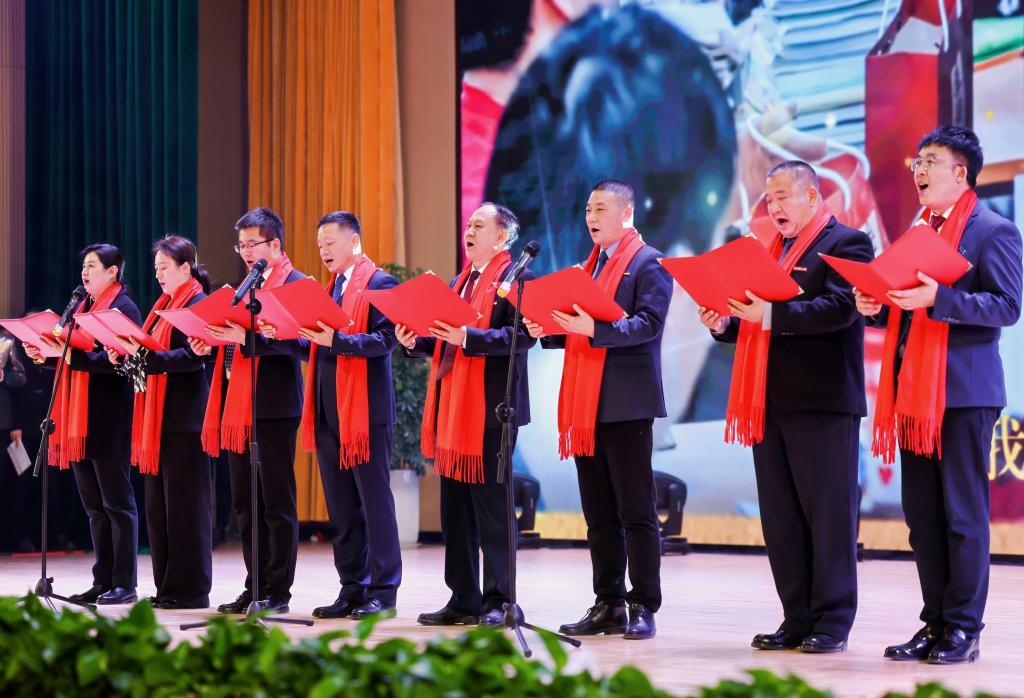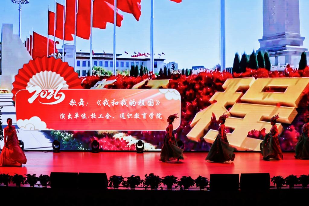晚会尾声,校工会与通识教育学院联合表演的歌舞《我和我的祖国》奏响爱国与爱校的双重主旋律,集团领导、校领导与全体演职人员、观众共同高歌,为本次晚会画上圆满句号。