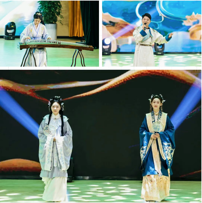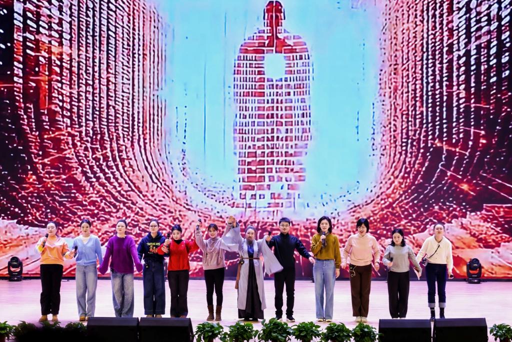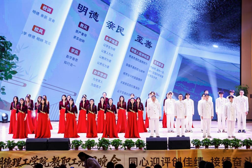 “再谱华章”篇章主要表达了锚定合格评估靶心,汇聚全校教职工智慧,彰显决战决胜豪迈志。语言文化传播学院与机关二工会的男女对唱《明德新貌》,唱出学校以迎评为契机实现的办学面貌新提升;经济与管理学院的歌舞《华章》、信息工程学院的舞蹈《喜乐年华》,以多样艺术形式描绘迎评成功后的美好愿景;艺术与设计学院和机关二工会带来的大合唱《明德之歌》,更是将对学校的热爱与迎评必胜的信念融入歌声,引发全场共鸣。