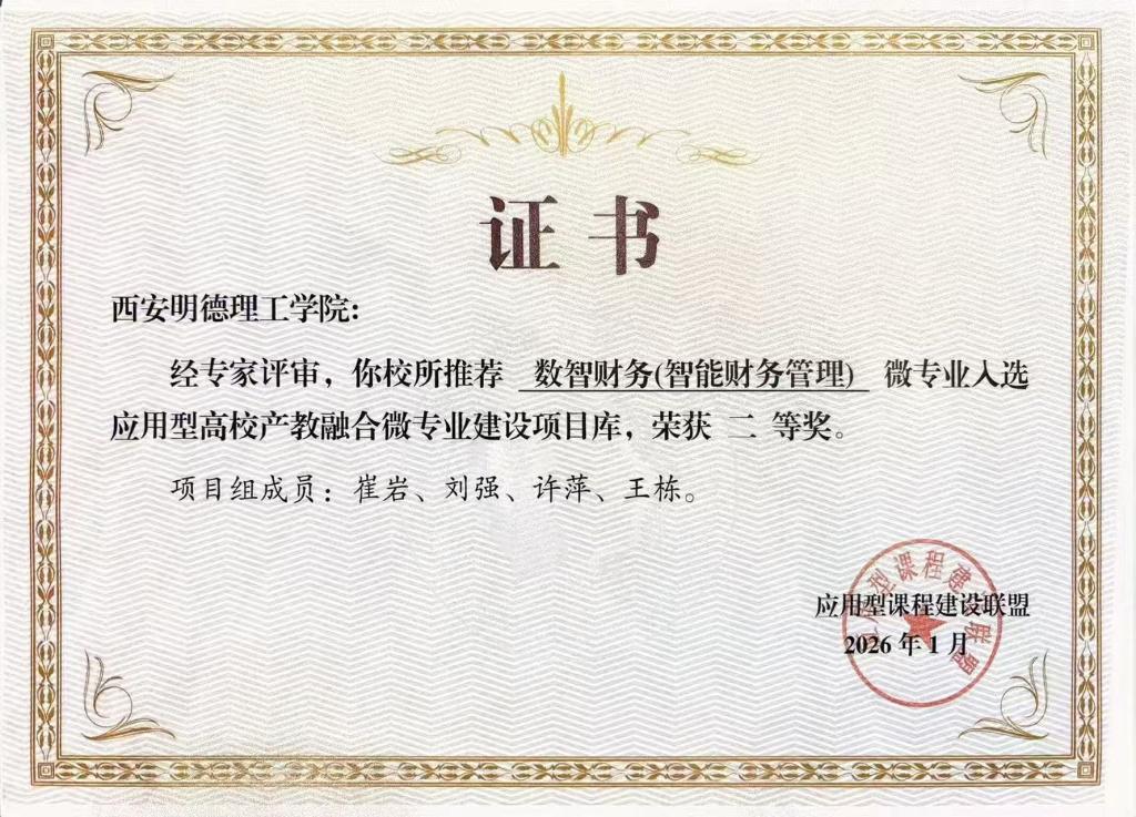此次获奖展现了beat365微专业建设在应用型课程建设与教学改革中的突出成果。值得一提的是,数智财务(智能财务管理)微专业已申报陕西省教育厅“双千”计划,标志着该专业在省级层面的战略布局与影响力进一步提升。