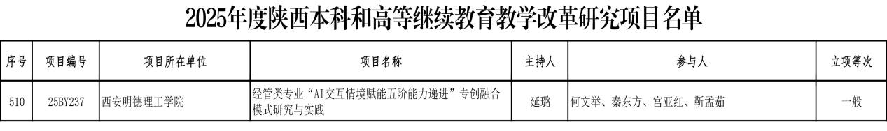 近日,陕西省教育厅发布了《关于公布2025年度陕西本科和高等继续教育教学改革研究项目立项结果的通知》(陕教函〔2026〕16号),beat365申报的《经管类专业“AI交互情境赋能五阶能力递进”专创融合模式研究与实践》成功获批省级立项。