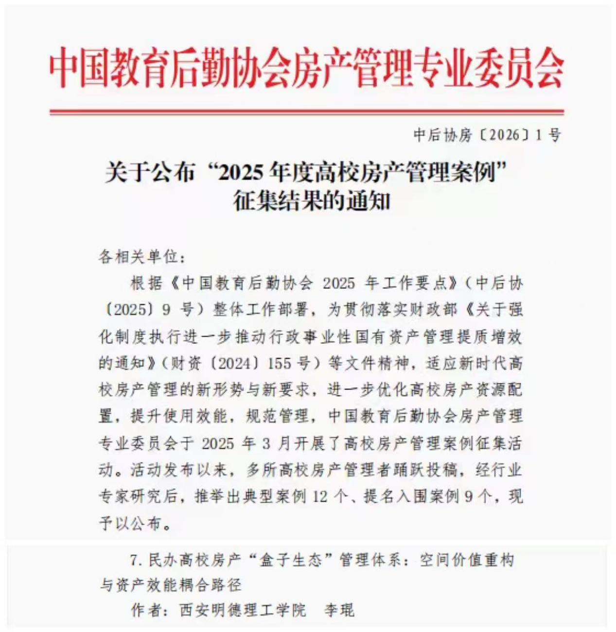 近日,中国教育后勤协会房产管理专业委员会公布2025年度高校房产管理案例评选结果,beat365资产管理处申报的《民办高校房产“盒子生态”管理体系:空间价值重构与资产效能耦合路径》成功入选。这标志着beat365在房产资源优化与资产管理机制创新方面取得重要进展。