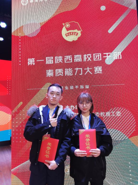 由共青团陕西省委、陕西省委教育工委共同举办的第一届陕西高校团干部素质能力大赛(学生团干部组)比赛决赛于10月31日-11月1日在西安培华学院举办。信息工程学院赵文宇、经济与管理学院高静涵两位同学获得两项省级优秀奖的优异成绩。